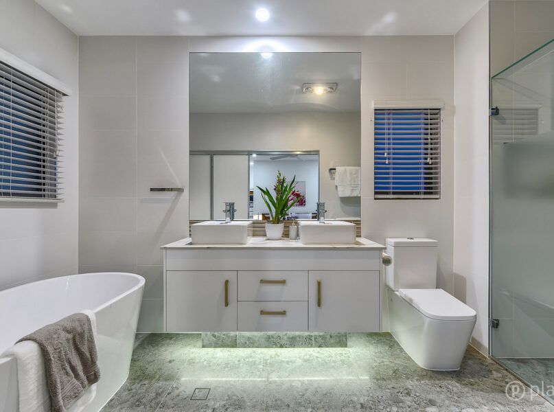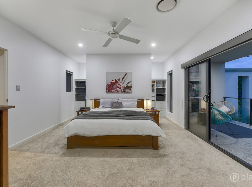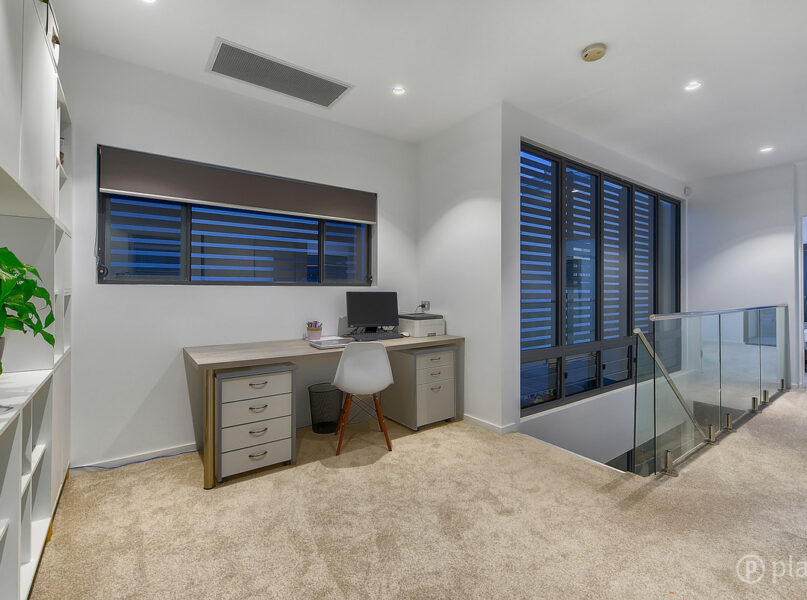 Upstairs features the home’s four bedrooms, including a master retreat fitted with an expansive wraparound walk-in robe, private balcony access with eastern aspect and an ensuite with double basin vanity, separate shower and freestanding bath. The remaining three bedrooms are all fitted with built-in robes and are serviced by the second bathroom with separate toilet, two of the bedrooms also enjoy access to the home’s front balcony with custom installed automatic weatherproof blinds, making this balcony another space for the guests, teenagers or just the spot for afternoon reading. On this level is also a playroom, office or extra area for storage.