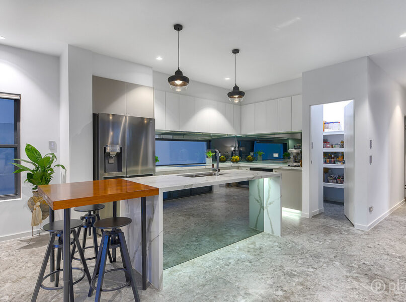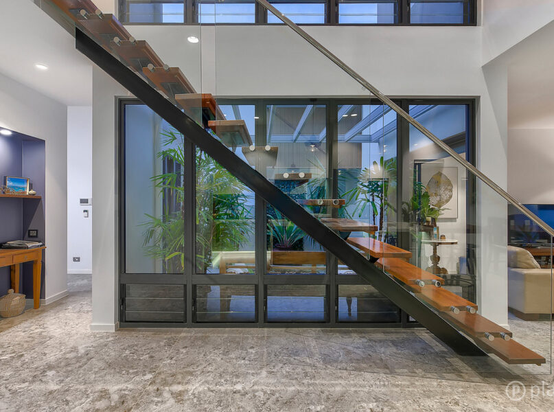 Boasting a practical layout, on the lower level, the light-filled main living features high ceilings, expansive windows, feature glass courtyard, and a modern kitchen. Appointed with waterfall stone benchtops, an abundance of cabinetry storage, butler’s pantry and a suite of Miele appliances, this kitchen is carefully positioned to flow onto the living, dining and outdoor courtyards, along with having a view of the yard and pool.