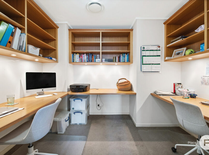 * Functional roomy study boasting built-in desks and shelving that is perfect for those who work from home