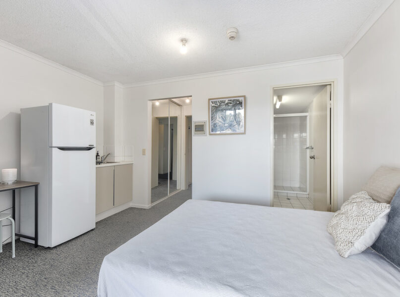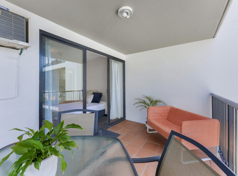 This studio style unit opens to a large private balcony almost as big as the flat and provides a great space for covered out door dining and/or entertaining friends.