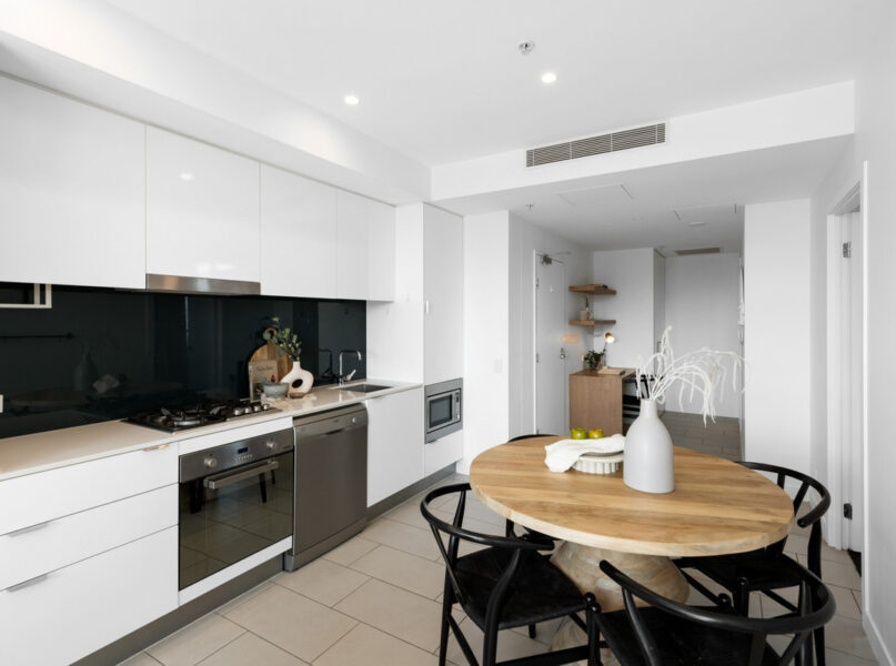 Kitchen: Modern and functional, seamlessly connecting to the living room for easy entertaining. Features a neutral color scheme, stone benchtops, quality appliances, a gas cooktop, oven, and dishwasher.