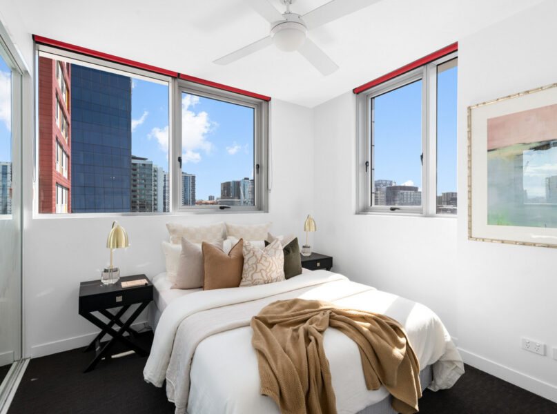 Layout: Two spacious bedrooms and a built-in study nook, complemented by bi-fold windows that offer panoramic views of the urban cityscape, flooding the entire apartment with natural light.