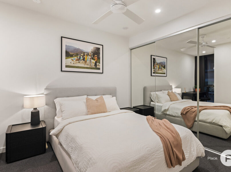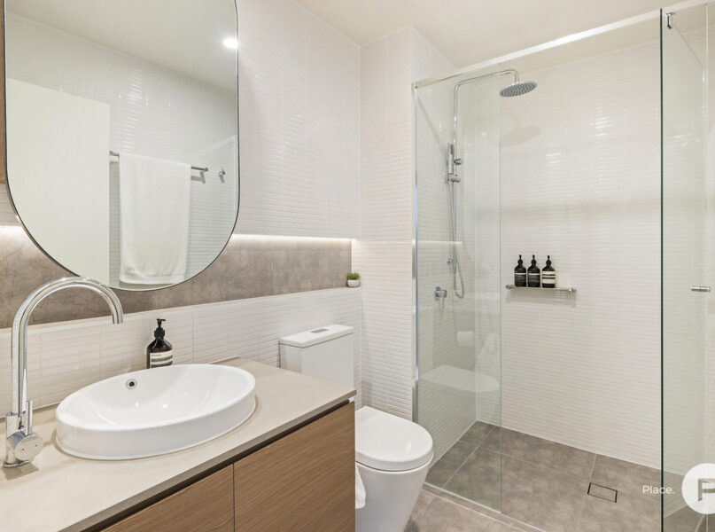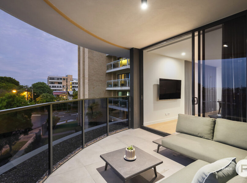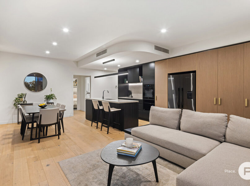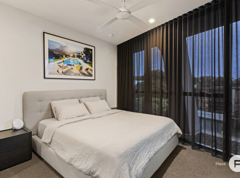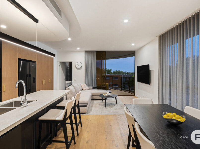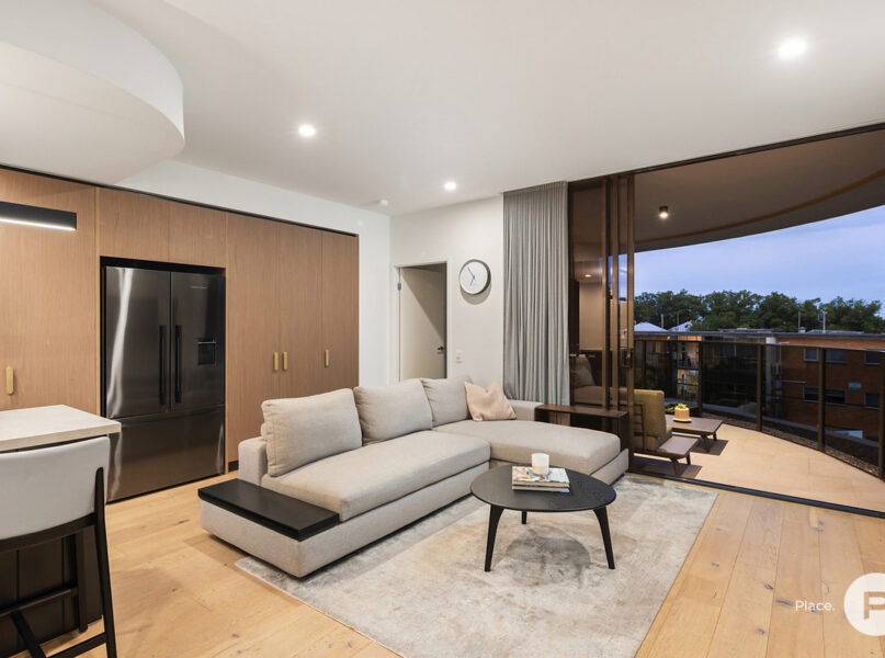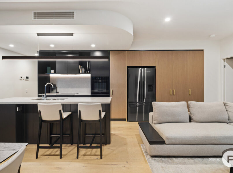 Ideally positioned for enjoying one of Brisbane’s most-loved enclaves, the apartment pays homage to its cosmopolitan setting with modern oak floors, sleek integrated cabinetry and full-height glass allowing natural light and easterly breezes. A modern neutral colour palette creates cohesion between each space.