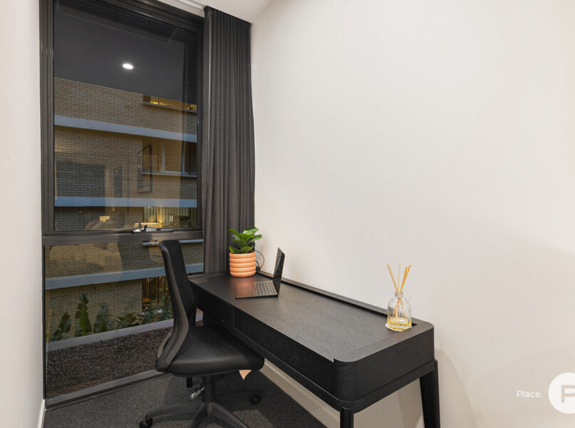 There is also a study nook, as well as an ensuited master bedroom with a walk-through robe, floor to ceiling glass windows and balcony access. The second and third bedrooms are located at the other end of the residence and have a sliding door for privacy. Both bedrooms have mirrored built-in robes and access to a generous main bathroom, which as storage and floor-to-ceiling tiling. The second bedroom also has a study nook.