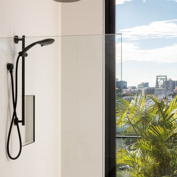 Looking out across the Brisbane River to the Story Bridge, the city skyline and the Gateway Bridge beyond, the apartment complements its extraordinary setting with full-height glass and sleek tiled floors. Lofty 3.2-metre-high ceilings, clean lines and stone accents create a sense of timeless elegance.