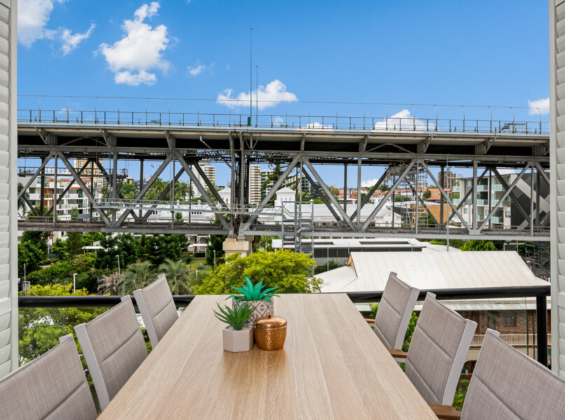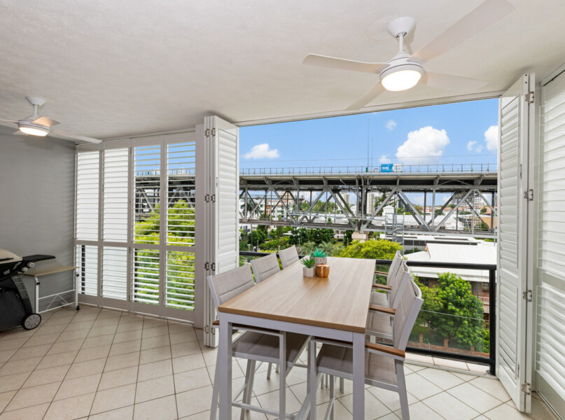 The lounge and dining area spans the length of the apartment and is framed by floor-to-ceiling glass sliders that flow out onto the spacious entertainer’s balcony. Looking out to the iconic Story Bridge, the eastern facing balcony offers the perfect space for entertaining and has been upgraded with outdoor ceiling fans and planation shutters, providing the option of an enclosed or open space.