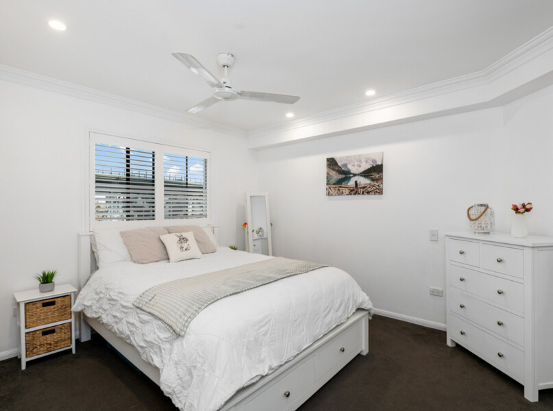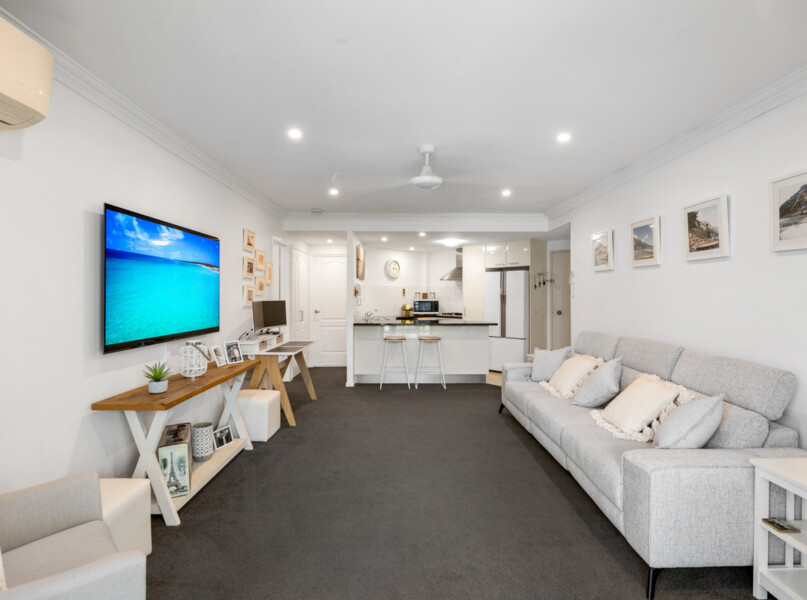 Well-appointed with an appealing modern colour palette and a suite of quality finishes, the kitchen features stone benchtops, a breakfast bar, ample cabinetry and stainless steel appliances. Modern in design, the residence has also been updated with downlights and electronic blinds throughout.