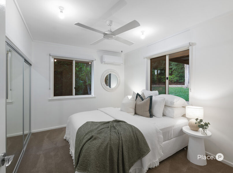 Bedroom 1: Carpeted, with mirrored built-in robes, ceiling fan, and split-system air conditioning.