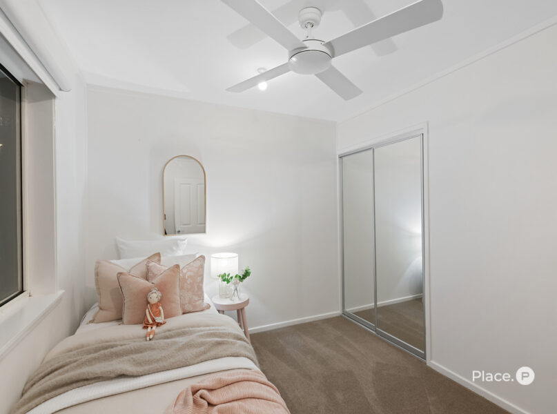 Bedroom 2: Carpeted, with a ceiling fan and mirrored built-in robes.