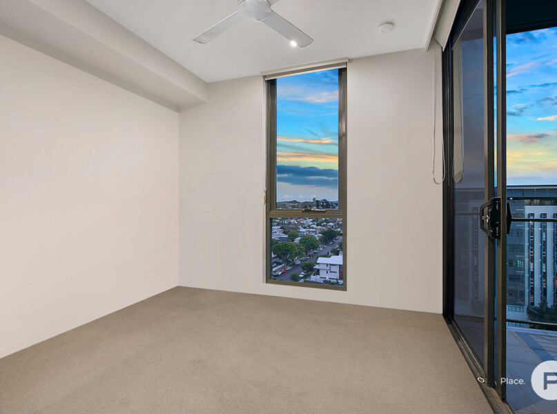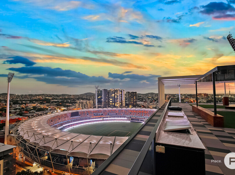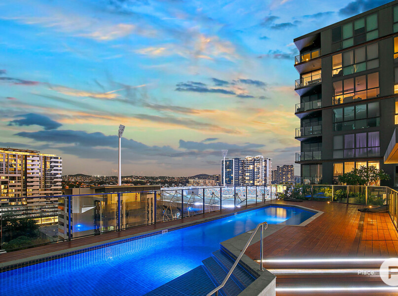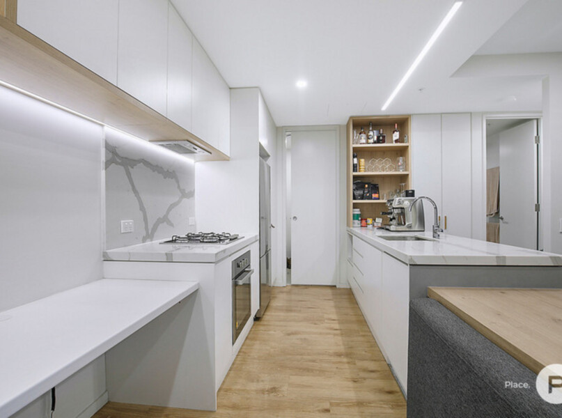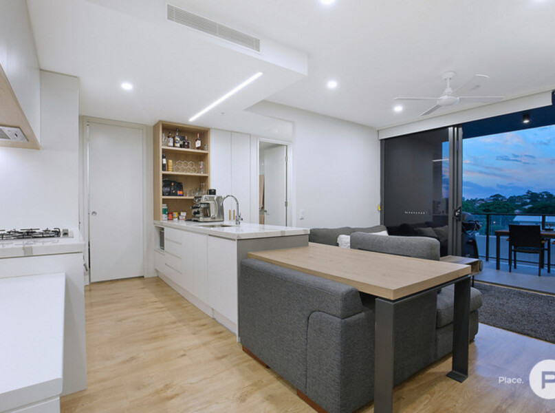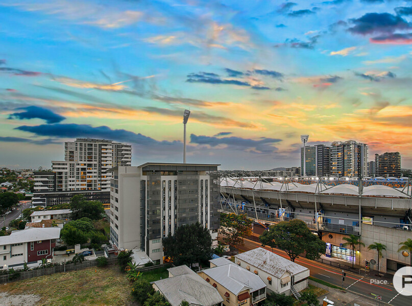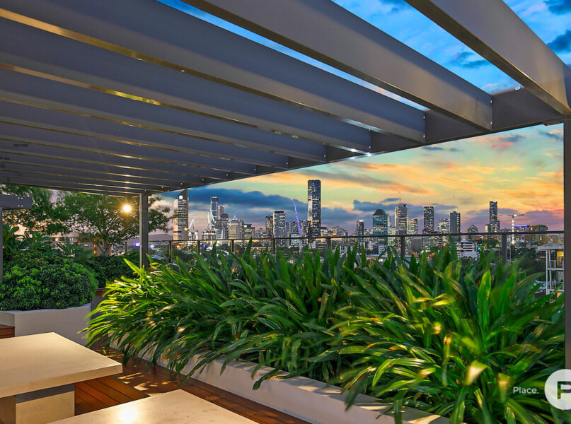 Looking out to magnificent Woolloongabba views, a spacious open-plan living and dining area allows you to relax and host guests in style. Steps away, a covered balcony provides a fabulous setting for al fresco meals and sunset drinks. You will also find a functional study nook, plus a modern kitchen displaying a breakfast bar, stone benchtops, quality appliances and ample cupboard storage.