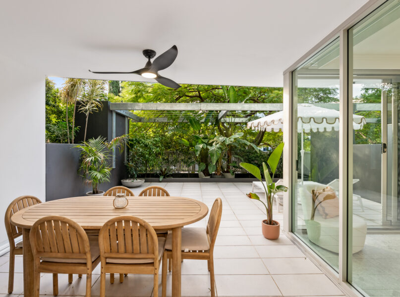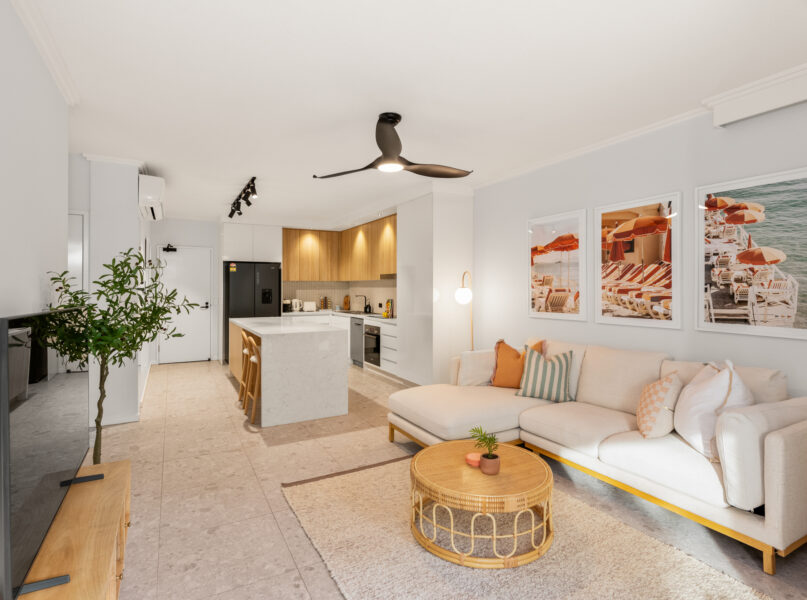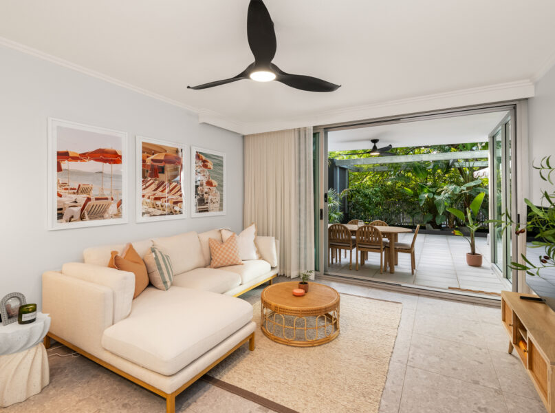 The modern kitchen boasts stunning 40mm stone bench tops, including a large waterfall island that provides both functionality and style—ideal for casual dining or hosting gatherings. The kitchen is designed for culinary enthusiasts, offering ample storage and high-quality appliances that elevate your cooking experience. The living area flows seamlessly into the expansive courtyard, which is thoughtfully designed for outdoor entertaining. This private oasis is enhanced by security features, including Crimsafe screens, ensuring both comfort and peace of mind.