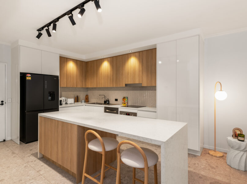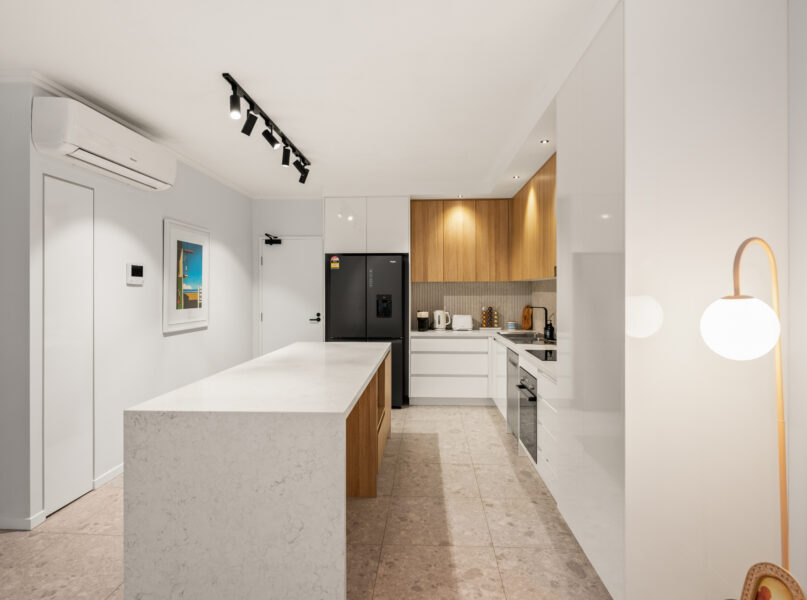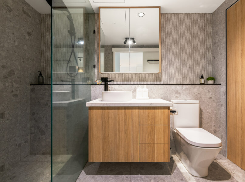The bathroom showcases luxurious herringbone feature tiles and matching stone finishes, creating a spa-like atmosphere for relaxation. Throughout the apartment, you will find stunning terrazzo and porcelain tiles that add to the modern aesthetic and provide a sense of continuity and elegance.