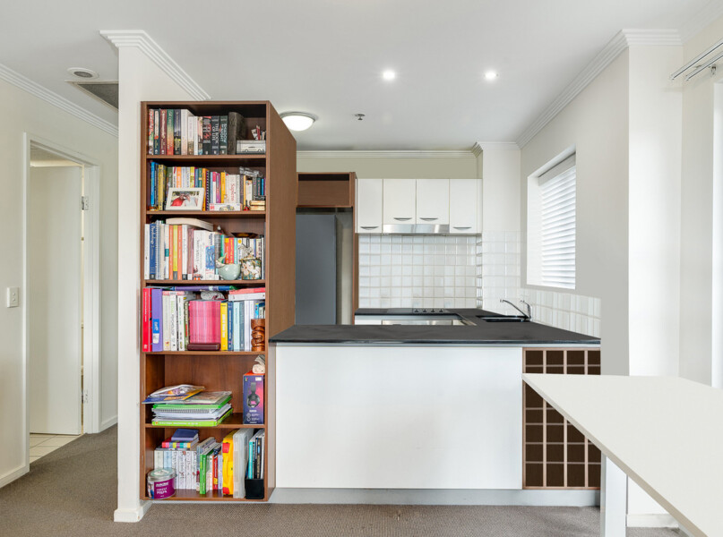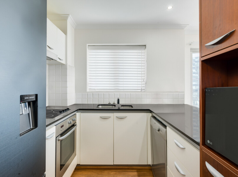The apartment’s modern aesthetic is highlighted by the sleek fitout. The kitchen exudes sophistication with its dark stone countertops and warm timber tones, creating a space that’s not only functional but also a design statement in itself. Imagine preparing gourmet meals or casual brunches in this stylish culinary haven.