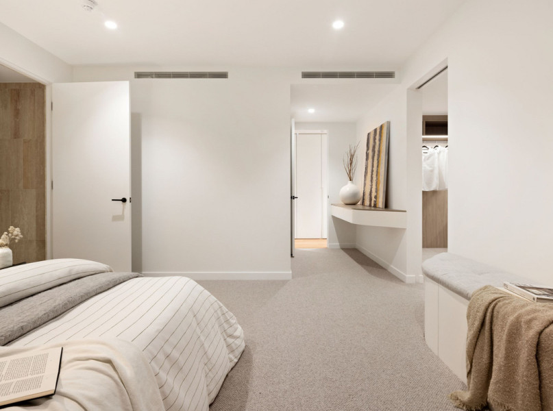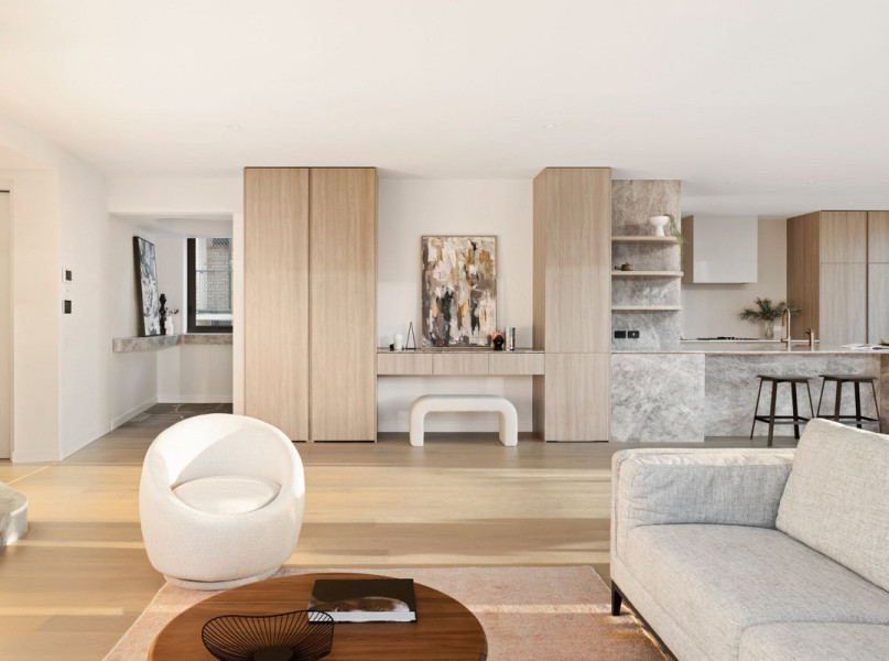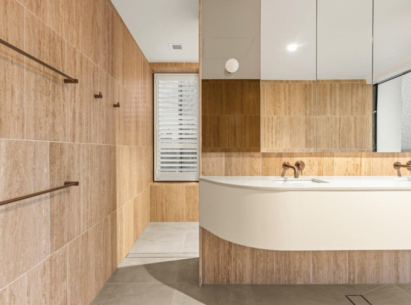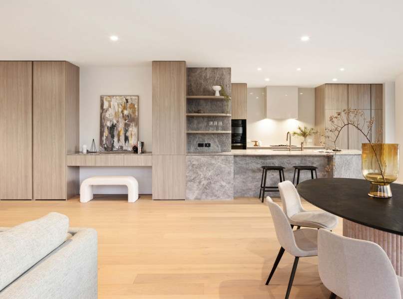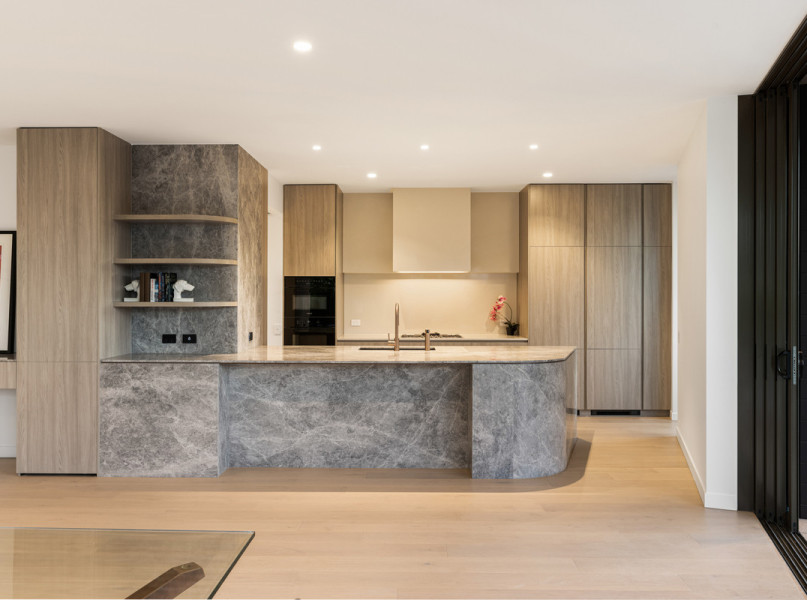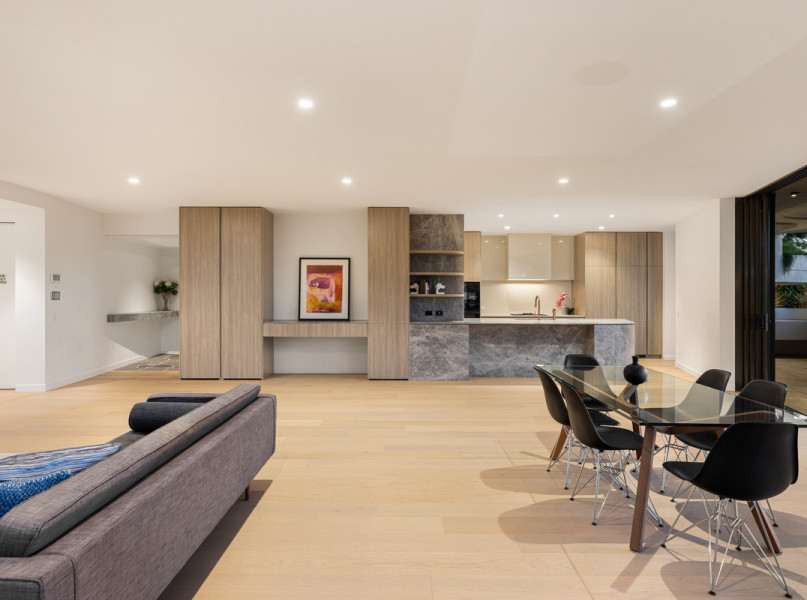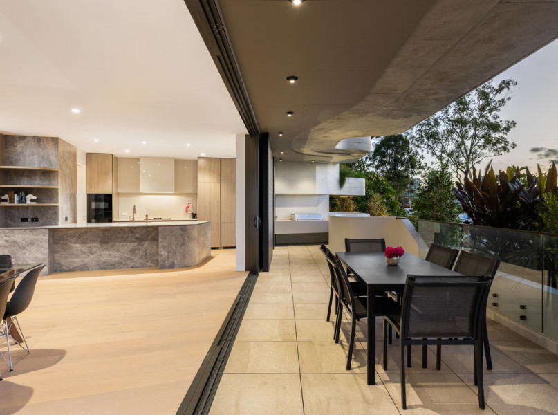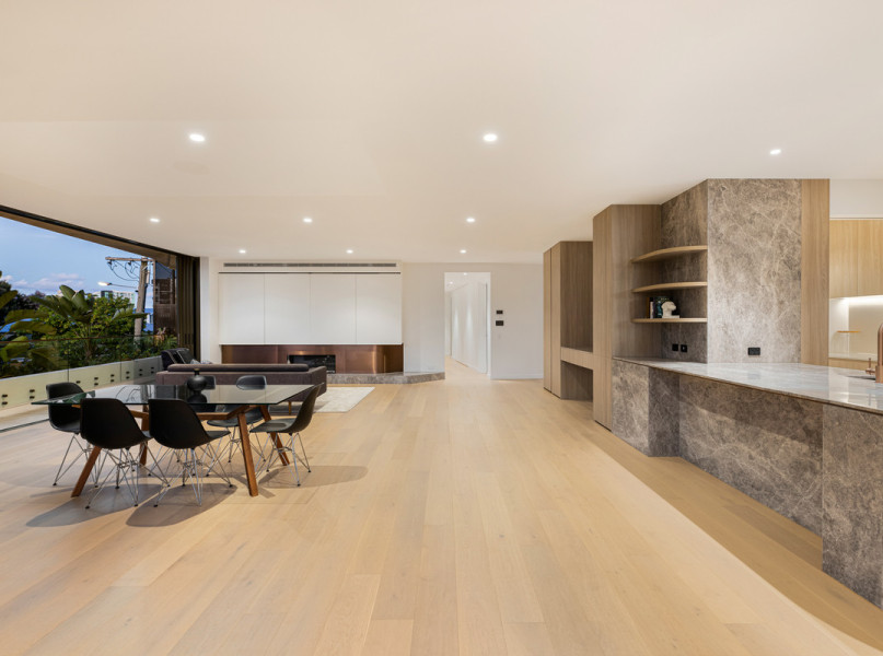 Spanning over 265m2, the residence has been crafted to create free-flowing, light-filled spaces that embrace the stunning uninterrupted views. An open-plan living, kitchen and dining area integrates seamlessly with the covered outdoor balcony, framed by floor-to-ceiling glass and high ceilings. Perfect for year-round entertaining, this central living area features a bespoke gas fireplace with aged bronze and natural stone. An integrated media unit comes cleverly concealed behind wall panels.