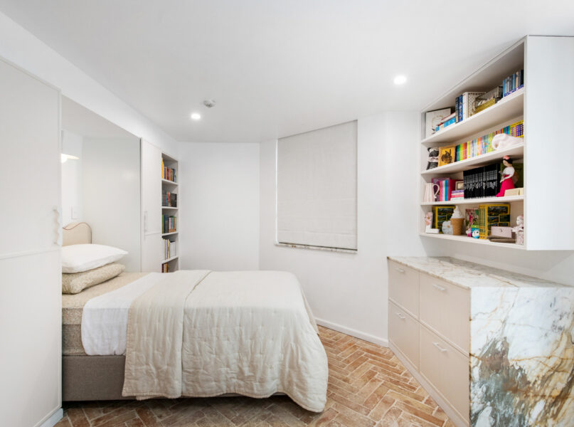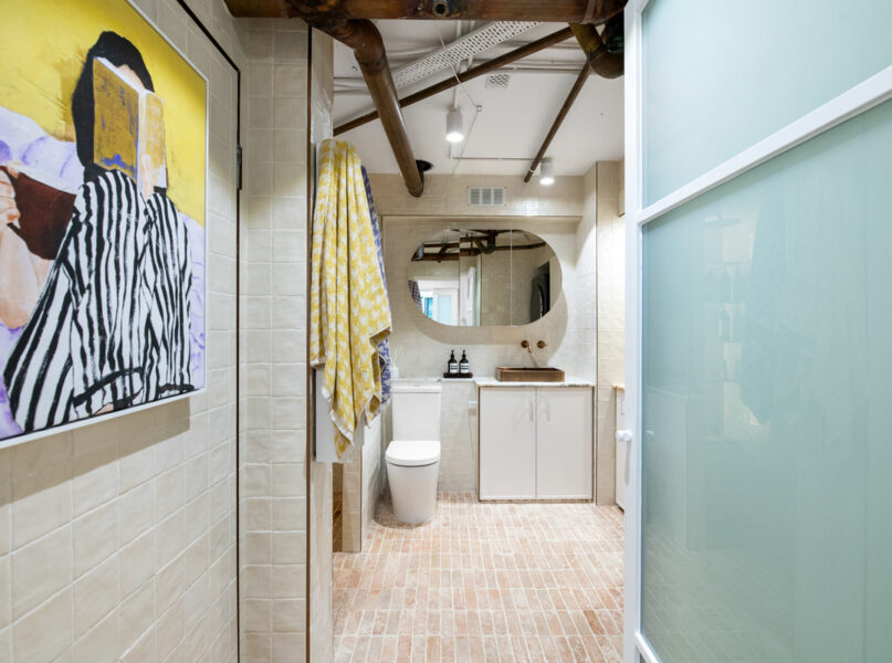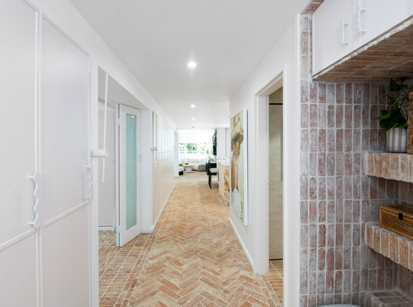 The Syrian Oatmeal terracotta tiles from Jatana interiors were the jumping off point for both the colour palette and apartment design. They chose this traditional material but modernised them by laying in a herringbone pattern and then mixed it up by introducing borders with a directional change in the smaller brick tile.