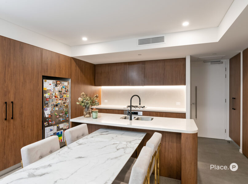 Positioned on Level 10 and capturing stunning views of the Brisbane city skyline, this beautifully appointed two-bedroom, two-bathroom residence offers effortless elegance and comfort. A light-filled, open-plan living and dining area seamlessly extends onto a large entertainers’ balcony, perfect for hosting or simply relaxing with a view. The chef’s kitchen is a striking centrepiece, featuring 40mm stone benchtops, a walk-in pantry, Miele integrated appliances, and extensive storage—all meticulously designed with both function and form in mind.