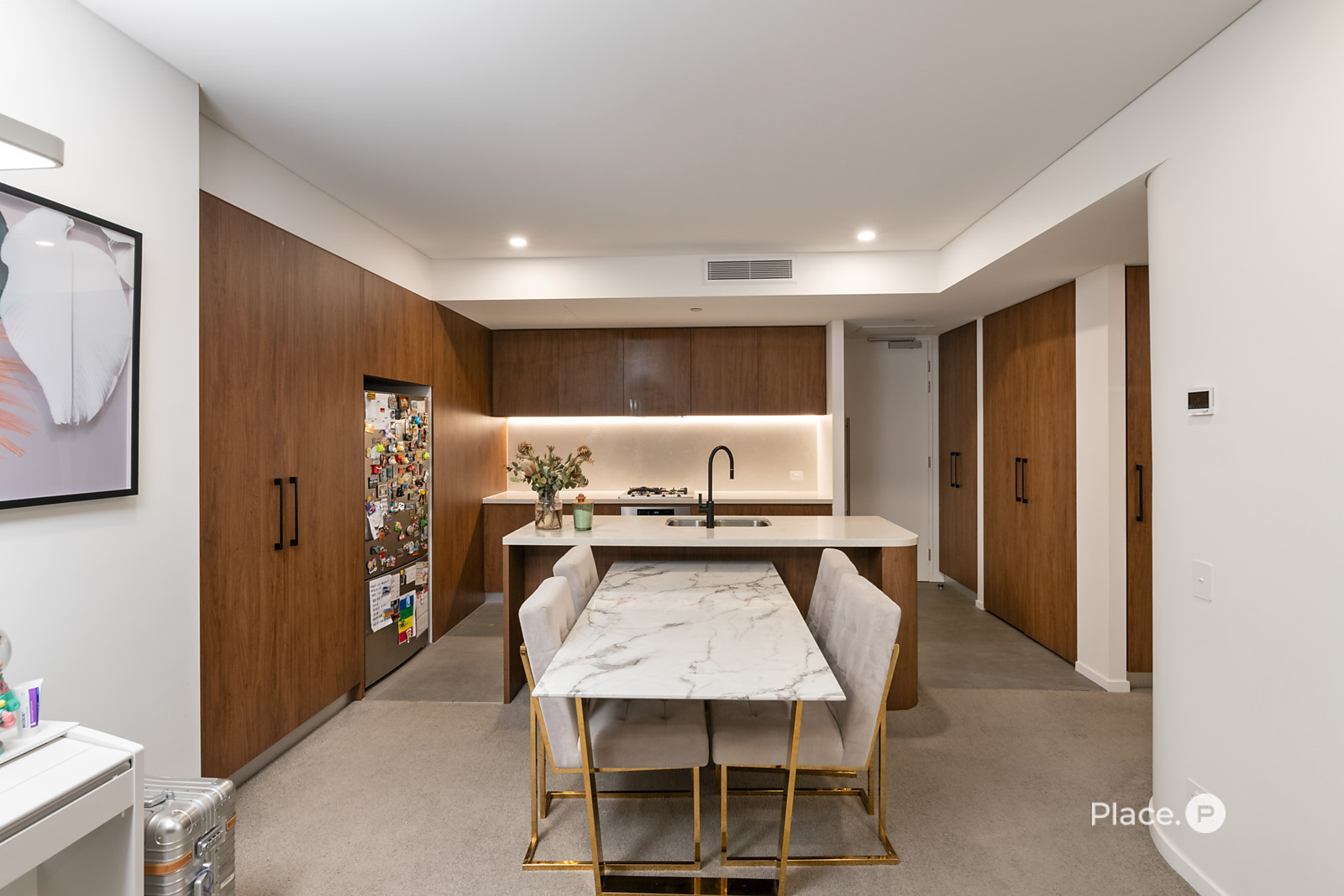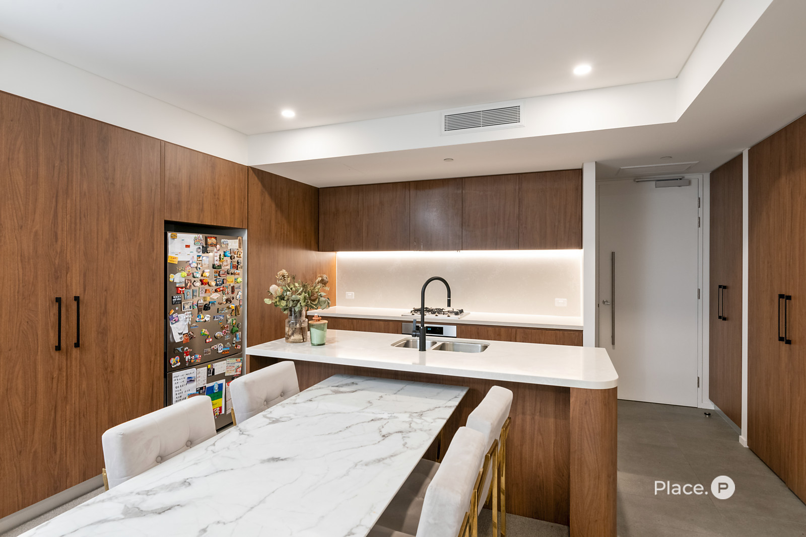Positioned on Level 10 and capturing stunning views of the Brisbane city skyline, this beautifully appointed two-bedroom, two-bathroom residence offers effortless elegance and comfort. A light-filled, open-plan living and dining area seamlessly extends onto a large entertainers’ balcony, perfect for hosting or simply relaxing with a view. The chef’s kitchen is a striking centrepiece, featuring 40mm stone benchtops, a walk-in pantry, Miele integrated appliances, and extensive storage—all meticulously designed with both function and form in mind.