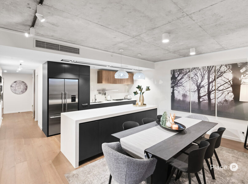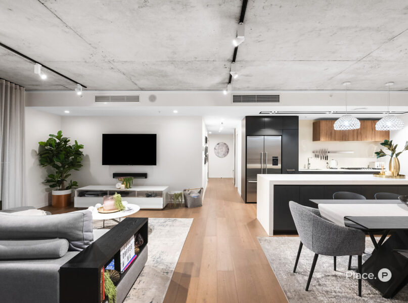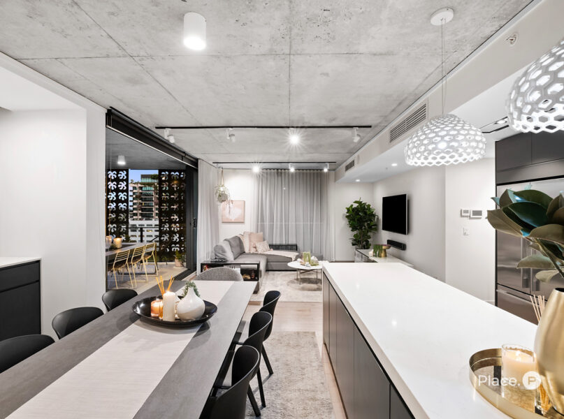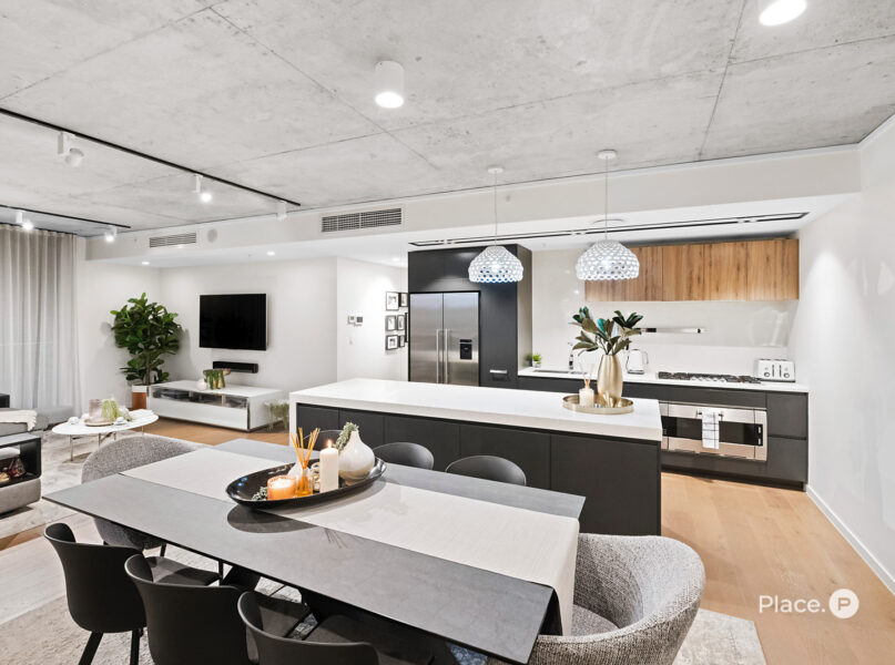 Showcasing a sleek monochrome palette and industrial-chic design, the interiors pair oak-toned timber flooring with concrete ceilings and designer pendant lighting. Expansive floor-to-ceiling glass floods the open-plan living and dining zone with natural light, framing panoramic urban vistas and creating an exceptional sense of space.