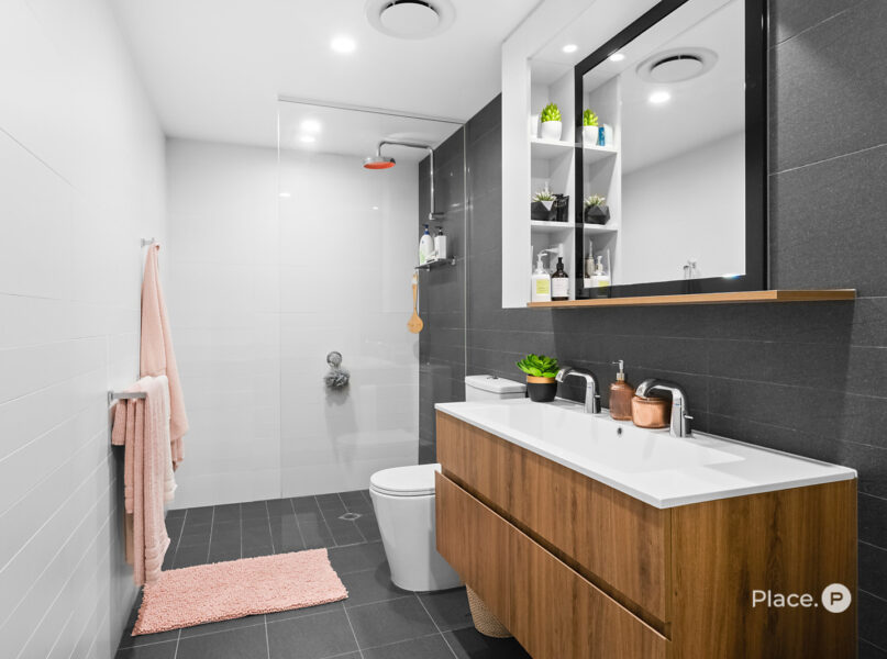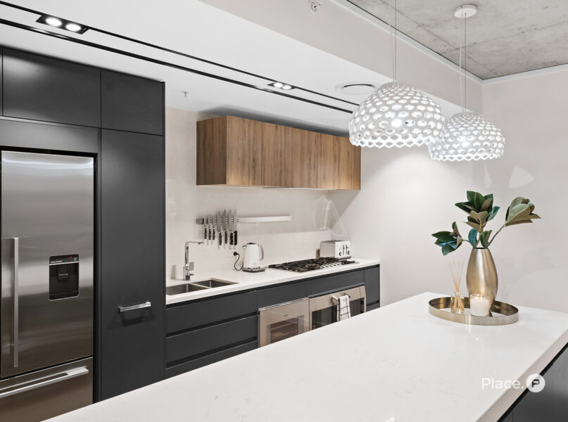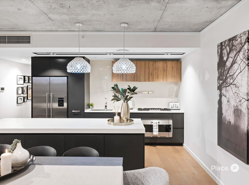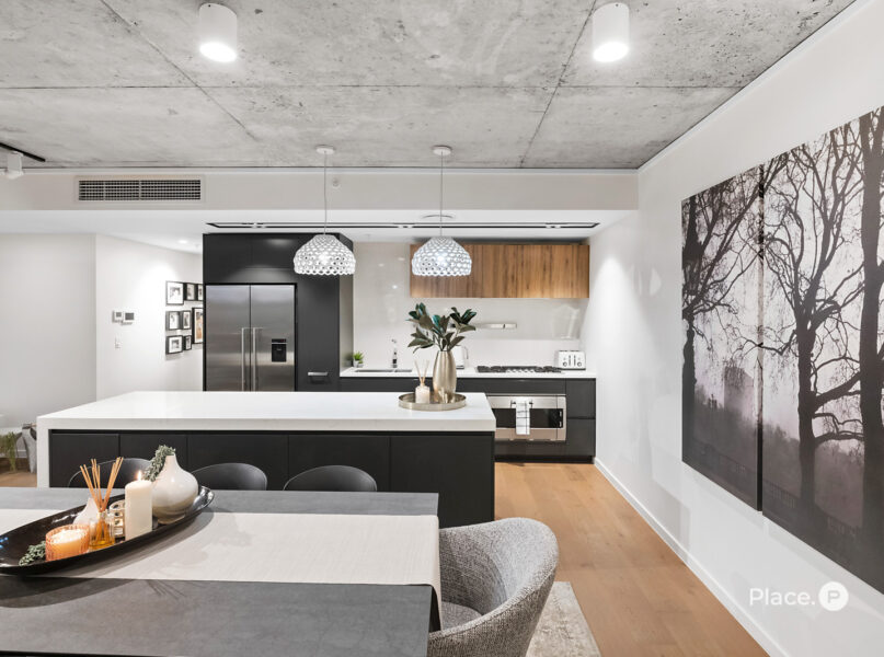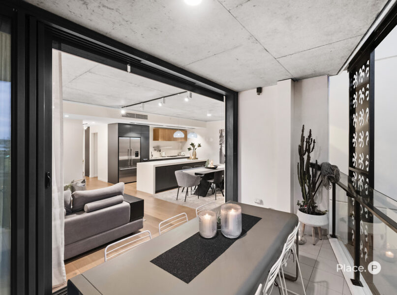 At the heart of the home is a chef’s kitchen that blends form with function – featuring Gaggenau appliances, a breakfast bar, and abundant storage, ideal for both casual meals and entertaining. Step outside to a large, covered balcony with privacy screening and leafy views across the West End landscape – a perfect retreat day or night.