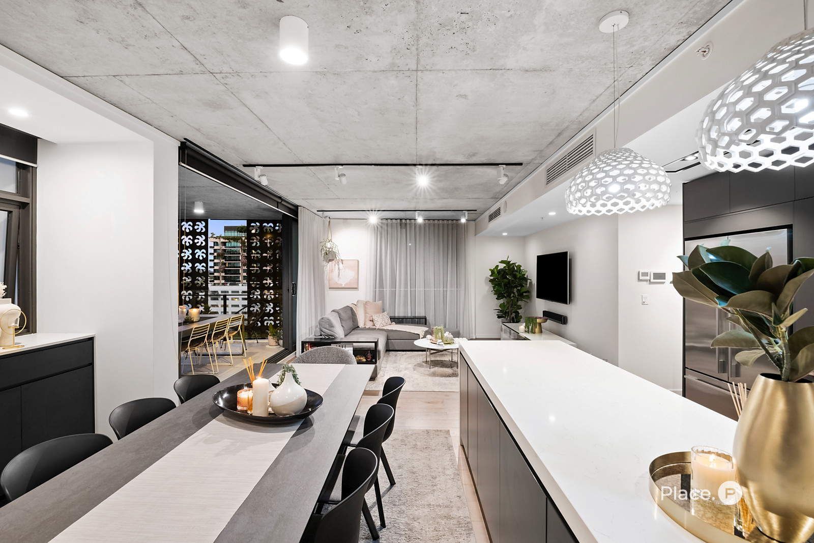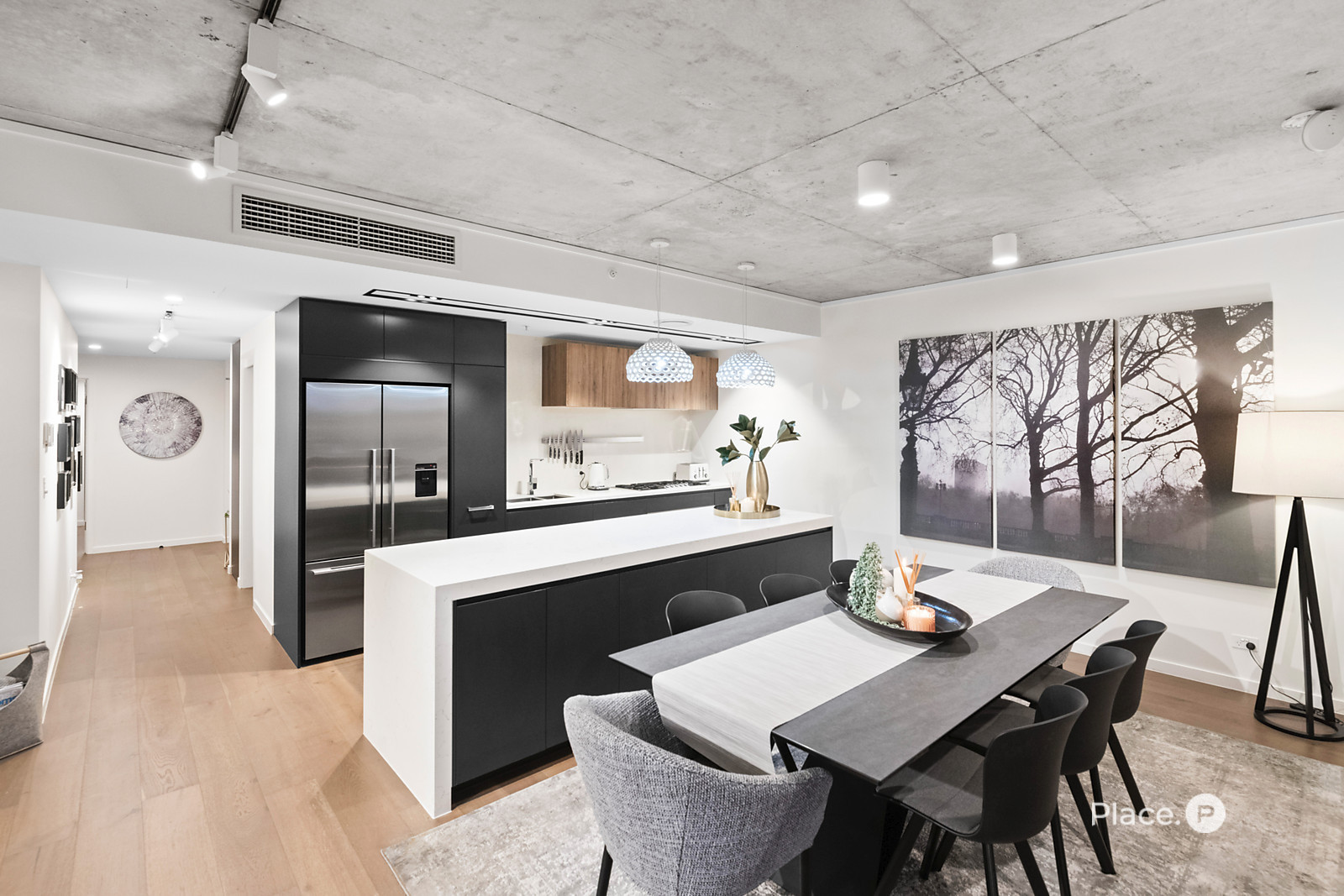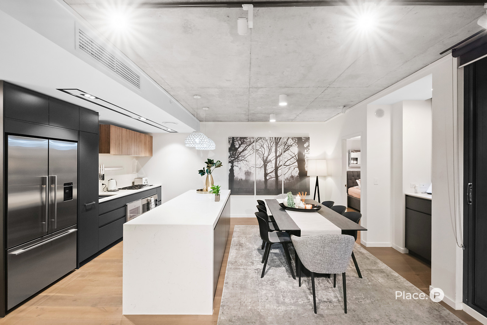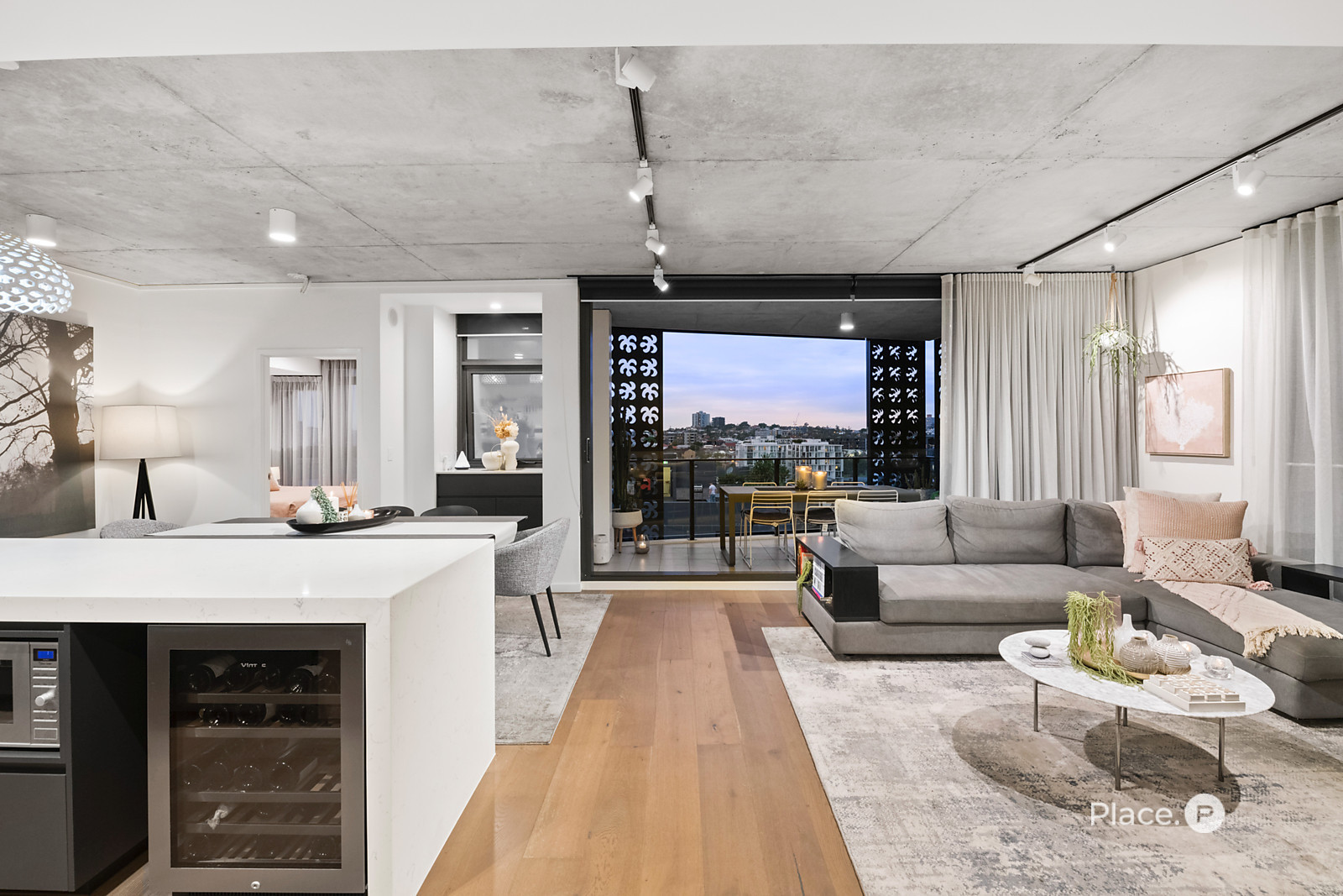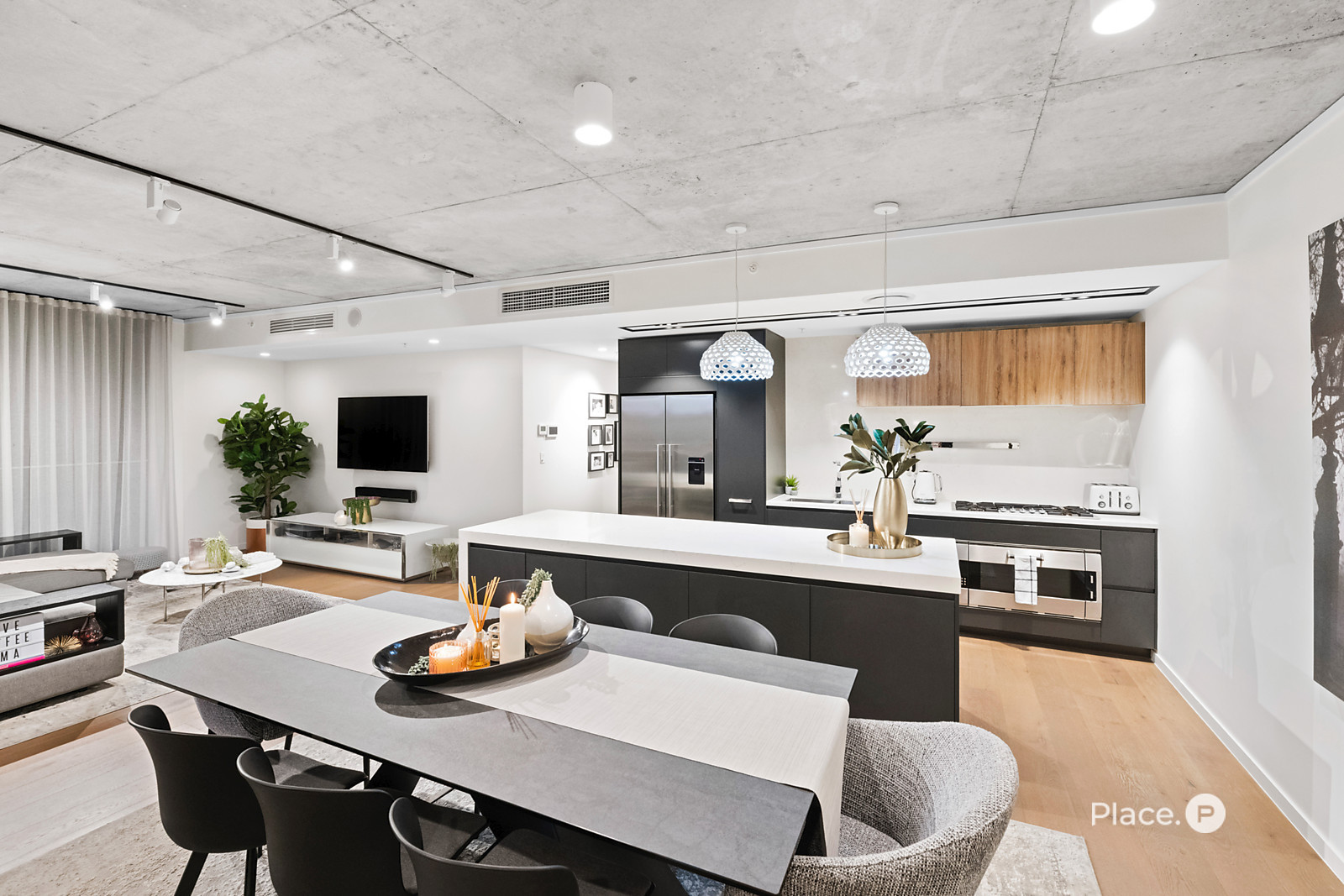 Showcasing a sleek monochrome palette and industrial-chic design, the interiors pair oak-toned timber flooring with concrete ceilings and designer pendant lighting. Expansive floor-to-ceiling glass floods the open-plan living and dining zone with natural light, framing panoramic urban vistas and creating an exceptional sense of space.