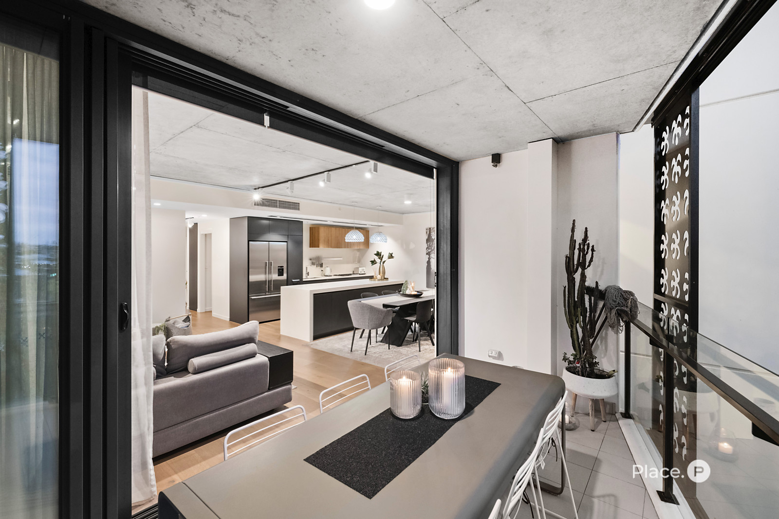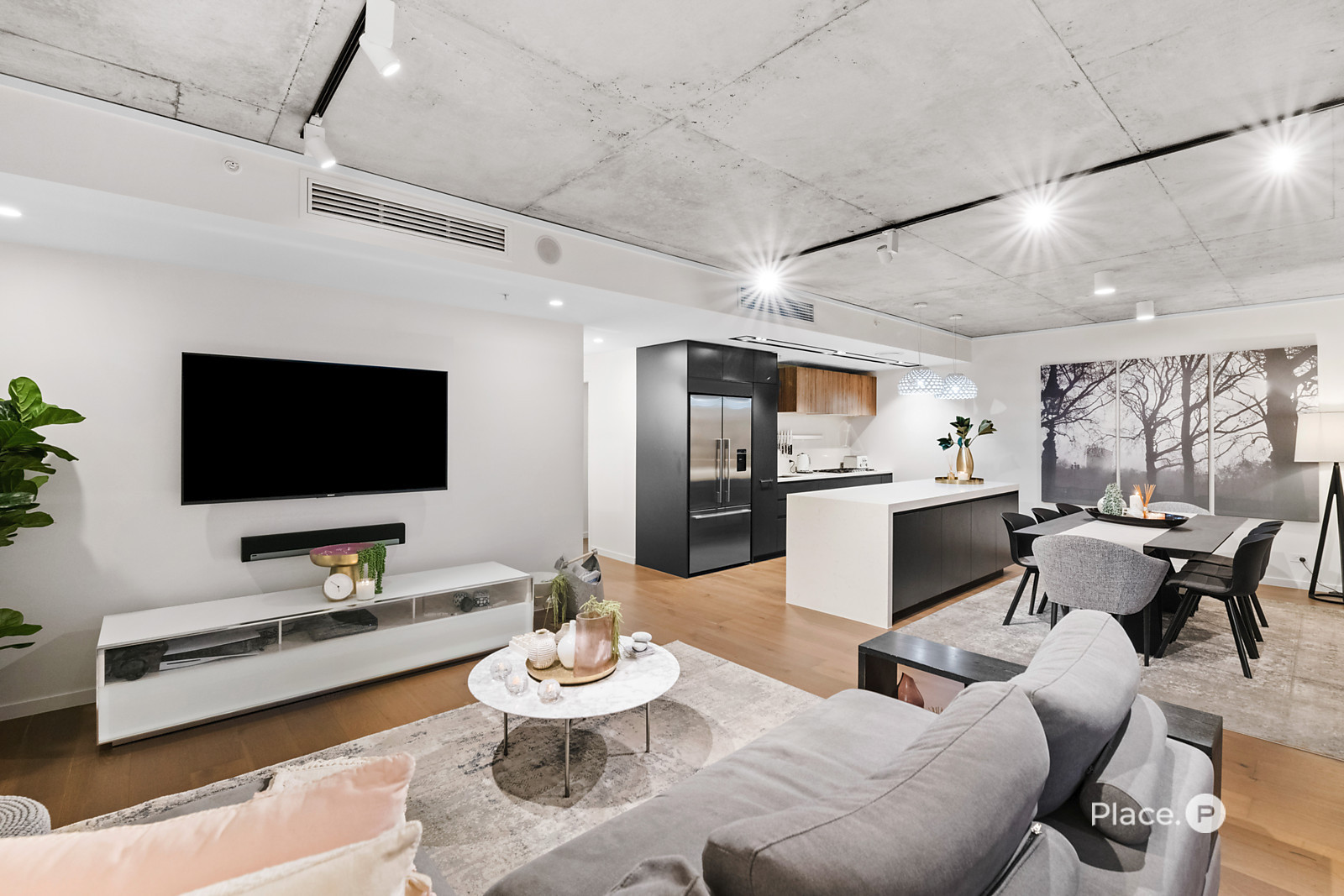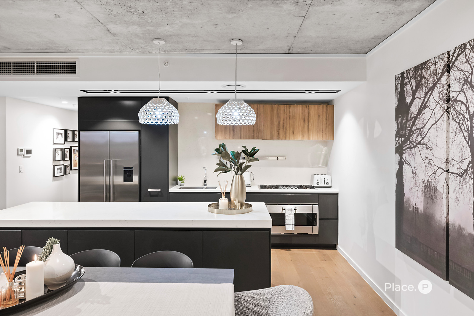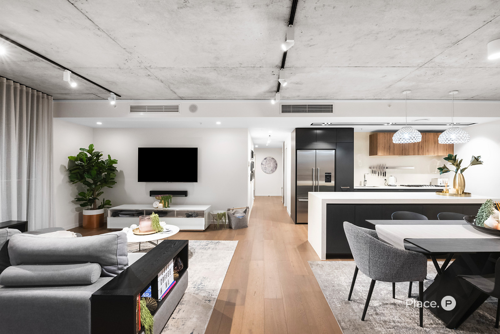 Showcasing a sleek monochrome palette and industrial-chic design, the interiors pair oak-toned timber flooring with concrete ceilings and designer pendant lighting. Expansive floor-to-ceiling glass floods the open-plan living and dining zone with natural light, framing panoramic urban vistas and creating an exceptional sense of space.