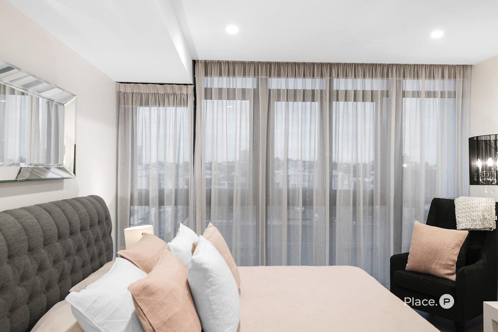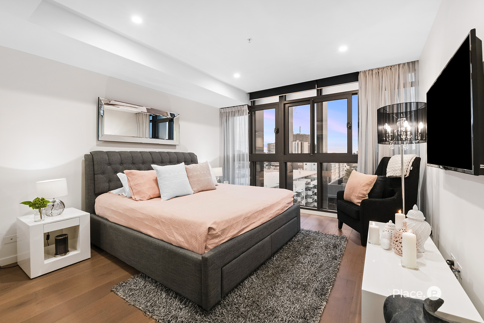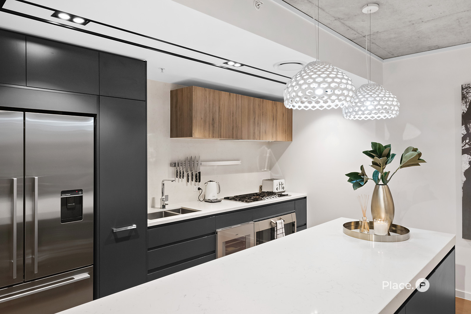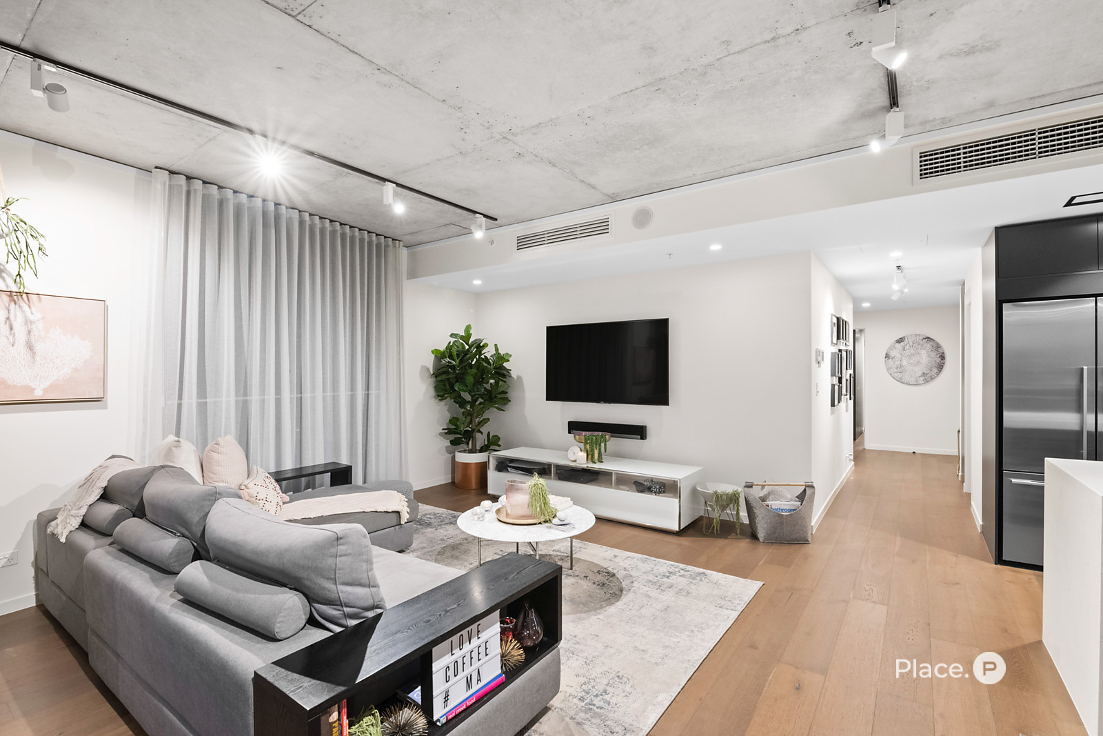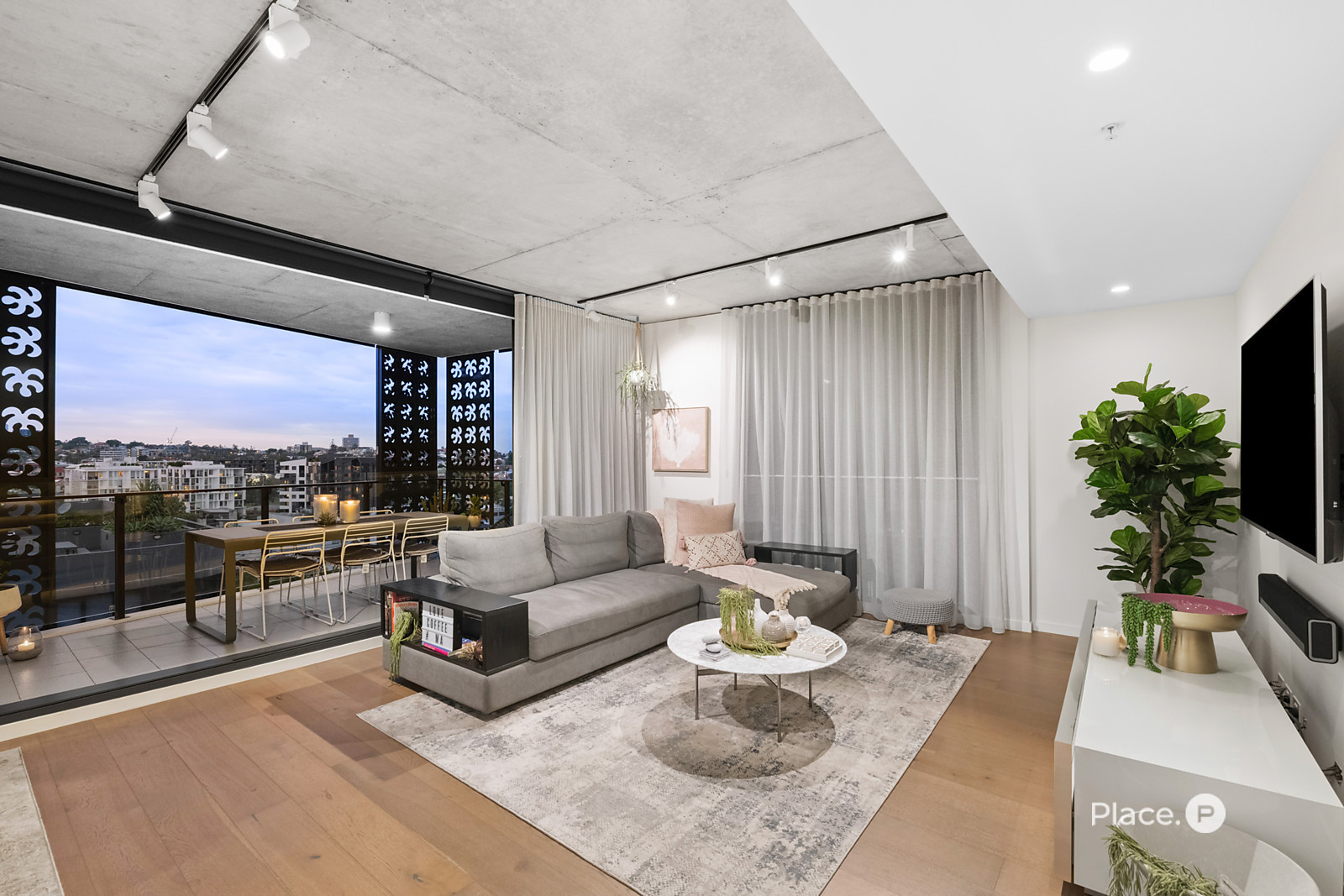 Showcasing a sleek monochrome palette and industrial-chic design, the interiors pair oak-toned timber flooring with concrete ceilings and designer pendant lighting. Expansive floor-to-ceiling glass floods the open-plan living and dining zone with natural light, framing panoramic urban vistas and creating an exceptional sense of space.