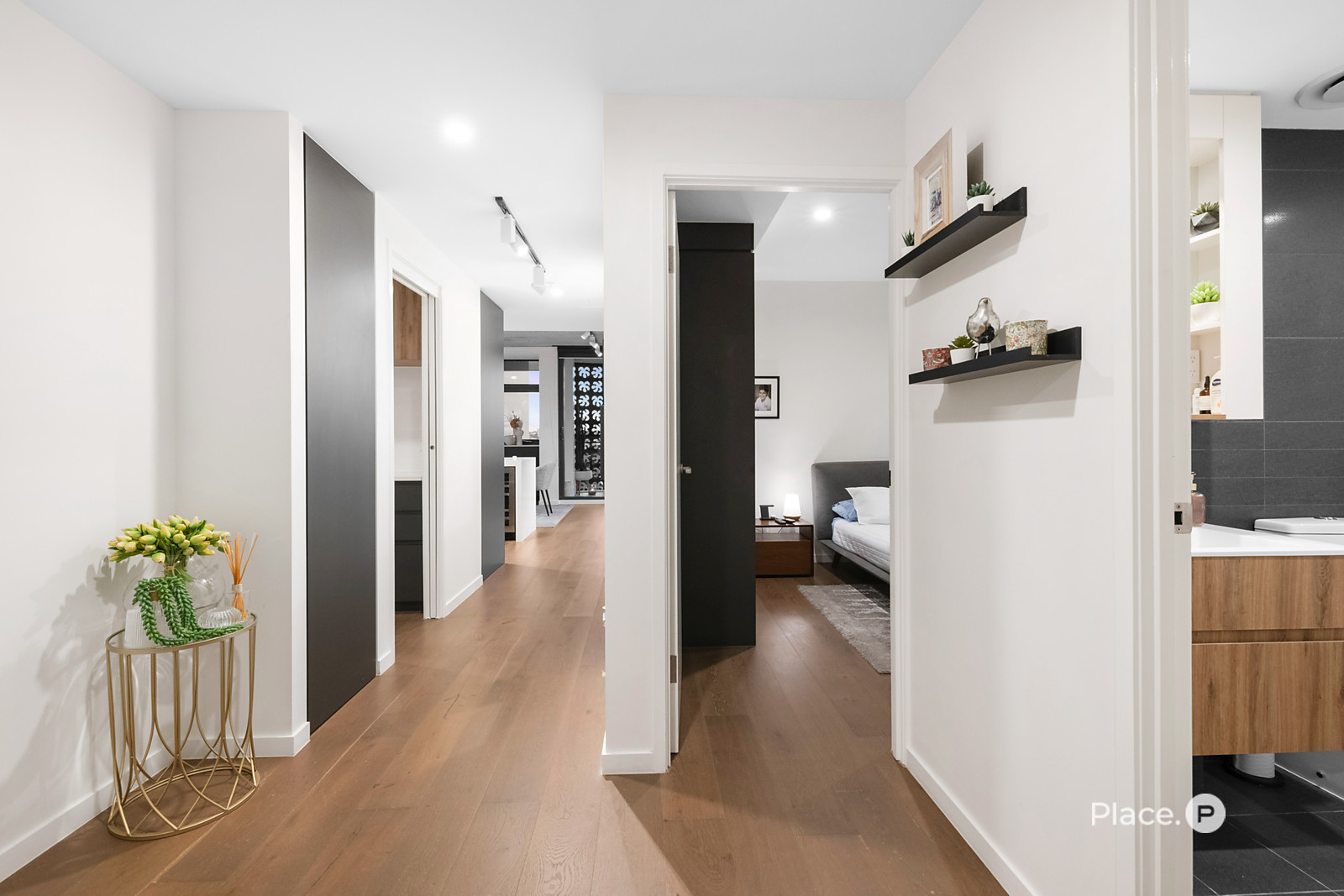 The master suite offers a private sanctuary with a generous walk-in robe, luxe ensuite, and tranquil outlook. Two additional bedrooms with built-in robes are serviced by a sophisticated main bathroom with floor-to-ceiling tiles and a frameless glass shower.