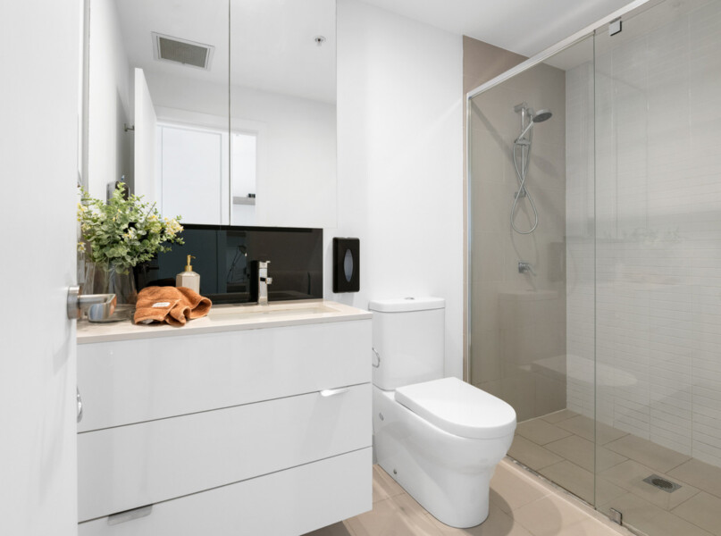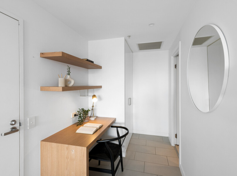 With a functional layout comprised of 2 spacious bedrooms and a built in study nook, bi-fold windows provide a view over an urban cityscape drenching the whole apartment with natural light. The modern kitchen opens out to the living room making entertaining here a breeze. The kitchen includes a neutral colour scheme with stone benchtops, quality appliances, a gas cooktop, oven and dishwasher.