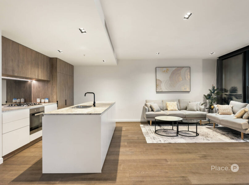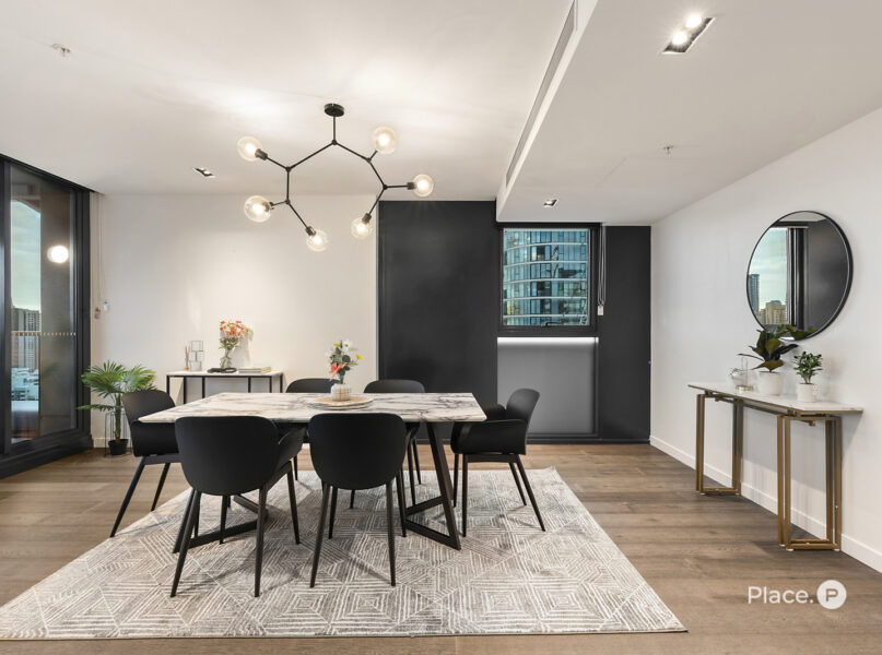 Looking out to the dazzling city skyline and iconic Story Bridge, the residence exudes modern refinement with its timber-look floors, lofty ceilings and fresh white colour palette. Full-height glass showcases the picturesque outlook and creates an airy atmosphere.