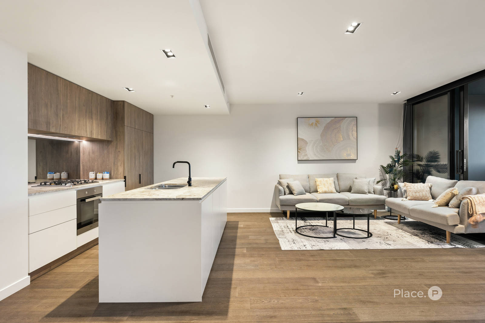 Looking out to the dazzling city skyline and iconic Story Bridge, the residence exudes modern refinement with its timber-look floors, lofty ceilings and fresh white colour palette. Full-height glass showcases the picturesque outlook and creates an airy atmosphere.