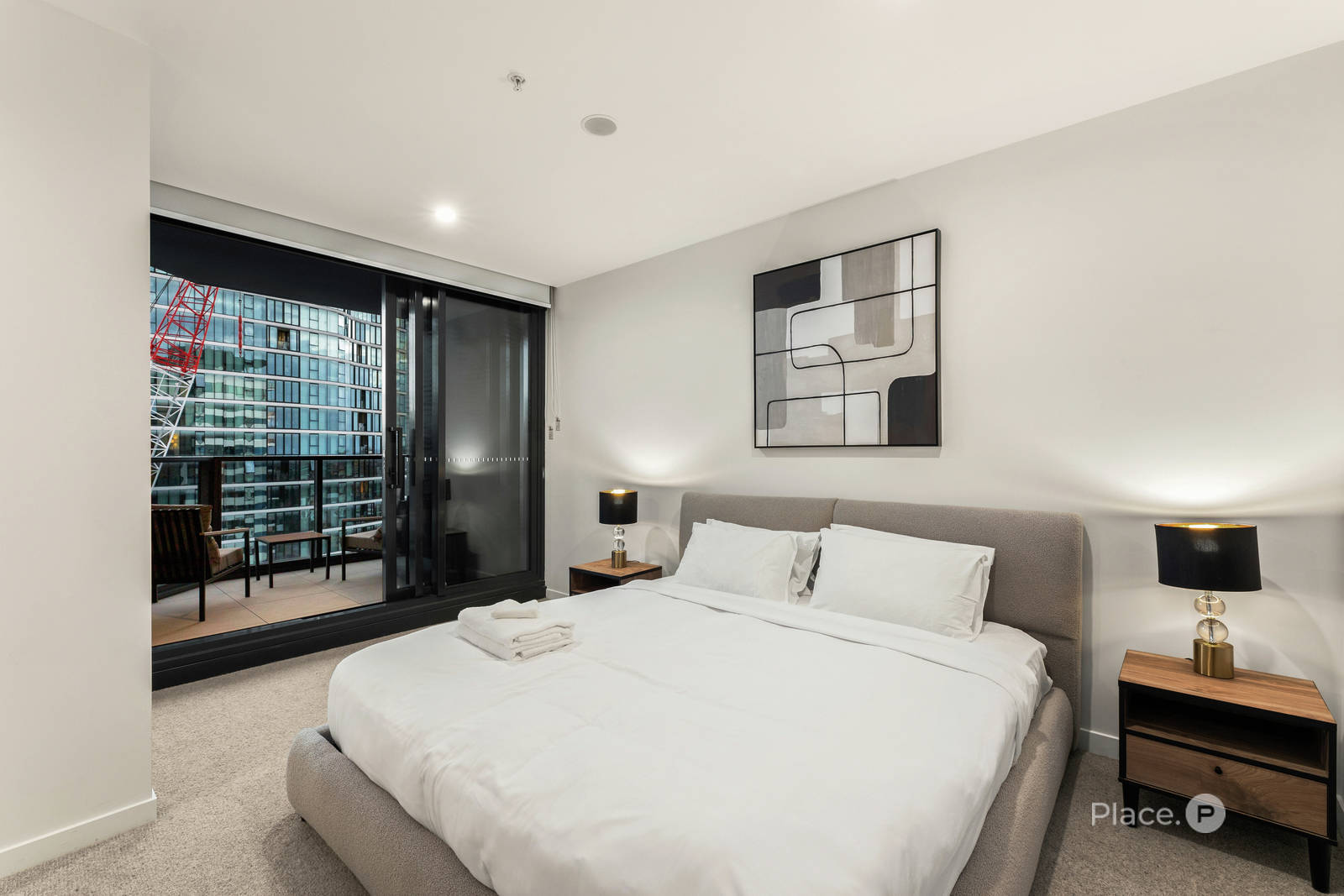 Forming the heart of the apartment, a spacious living area adjoins a generous dining space. Both spill out onto a covered balcony commanding mesmerising urban views. Here, gather family and friends for a relaxed al fresco meal or sunset drinks.