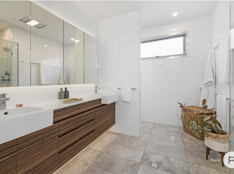 – Adjoining ensuite encompassing dual vanities and mirrored cabinetry