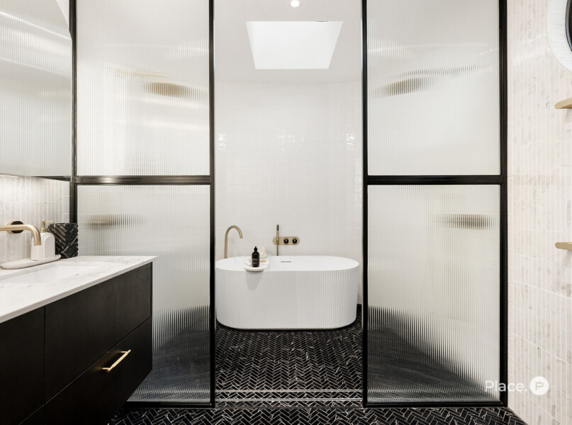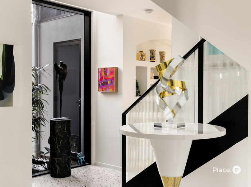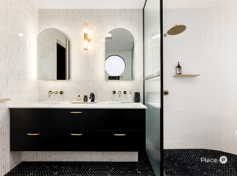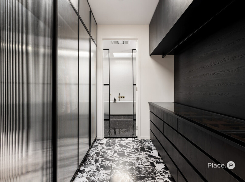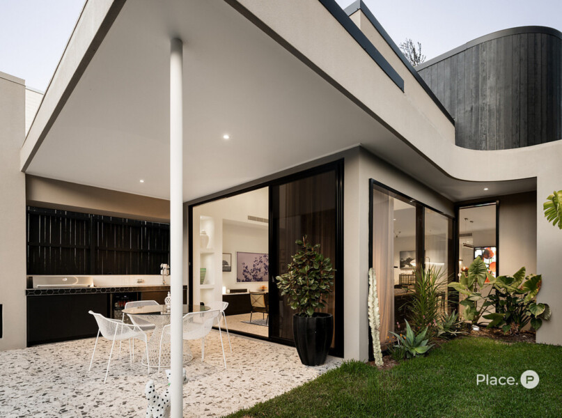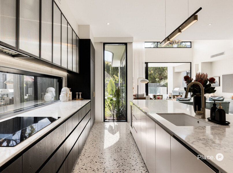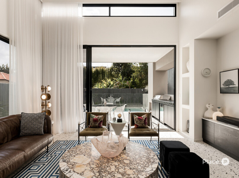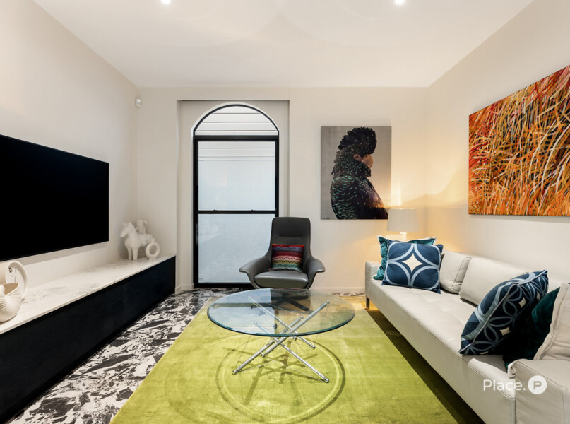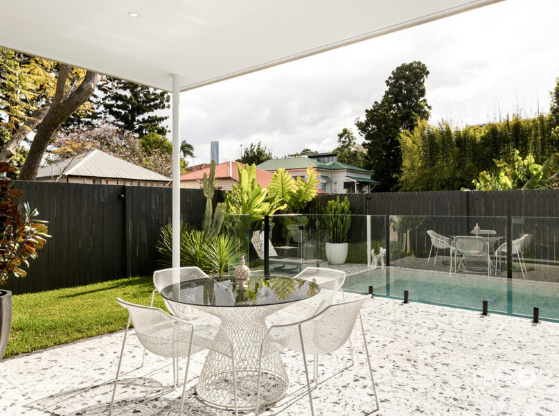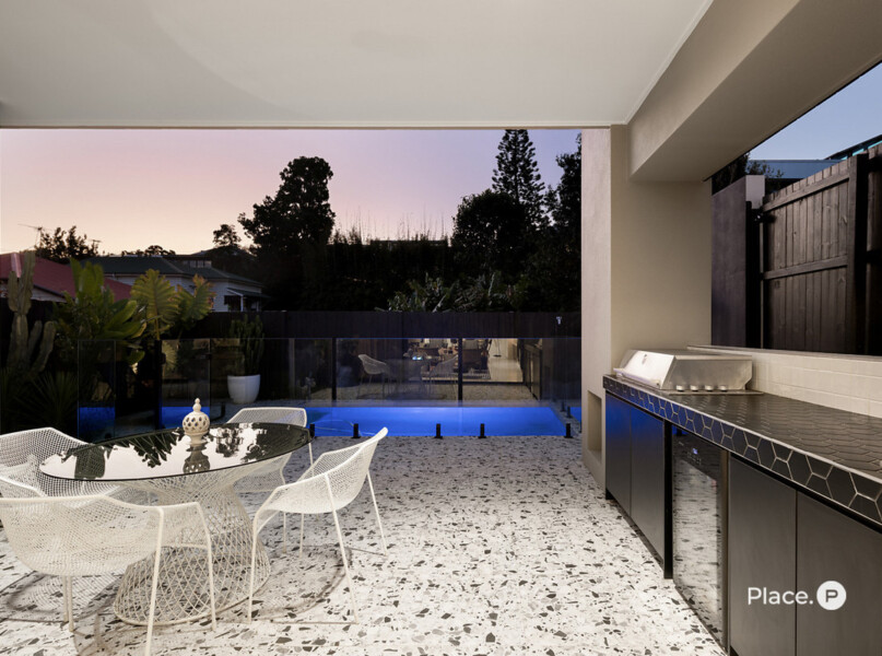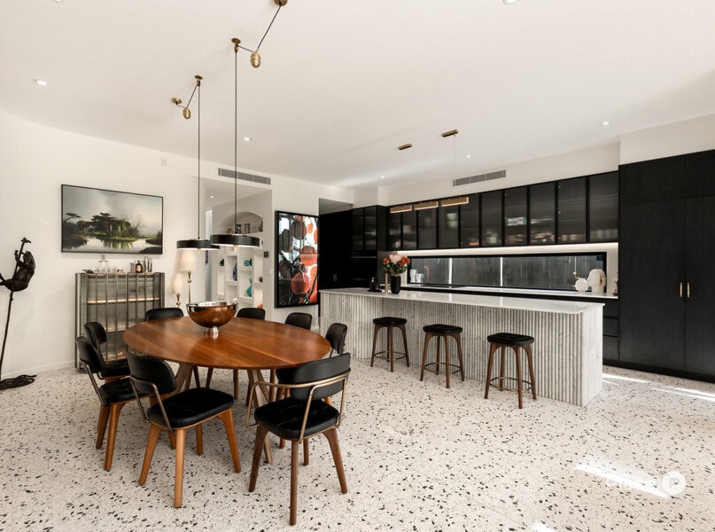 Ideally situated amongst quality residences in one of Brisbane’s most sought-after enclaves, the home is set on a freehold 351sqm allotment. Complementing its cosmopolitan setting, the property makes an outstanding first impression with its striking black facade and landscaped front gardens. Inside, exquisite details such as Terrazzo tiling, lofty ceilings and a timeless monochromatic colour palette are showcased throughout.