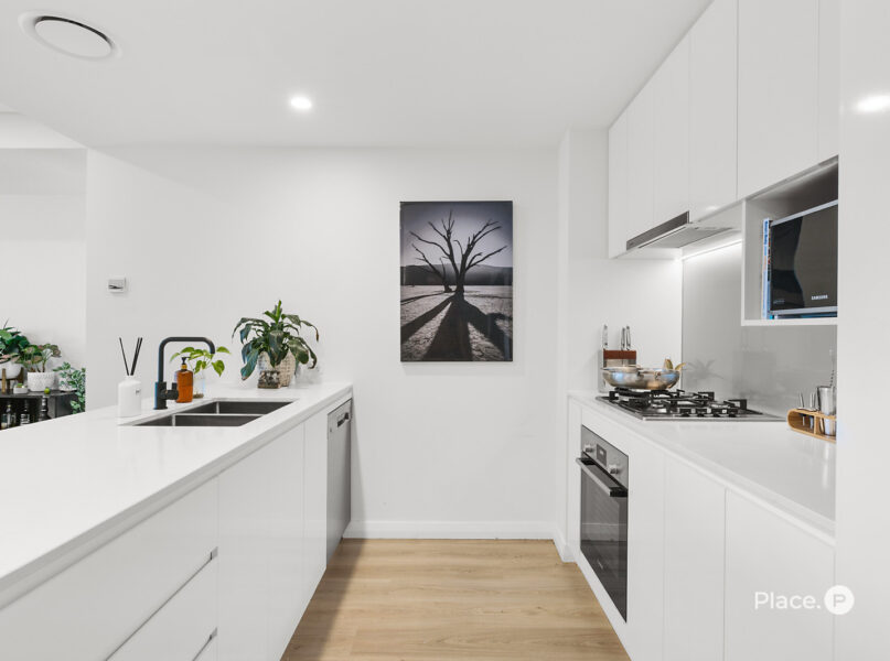 Inside, the apartment reveals one of the most generous living areas in the building — open, flowing, and filled with natural light. The layout allows you to live expansively, with room to entertain or simply to pause and take in the skyline beyond. The kitchen anchors the space with a refined mix of stone benchtops, gas cooking, and premium appliances — elegant yet entirely practical.