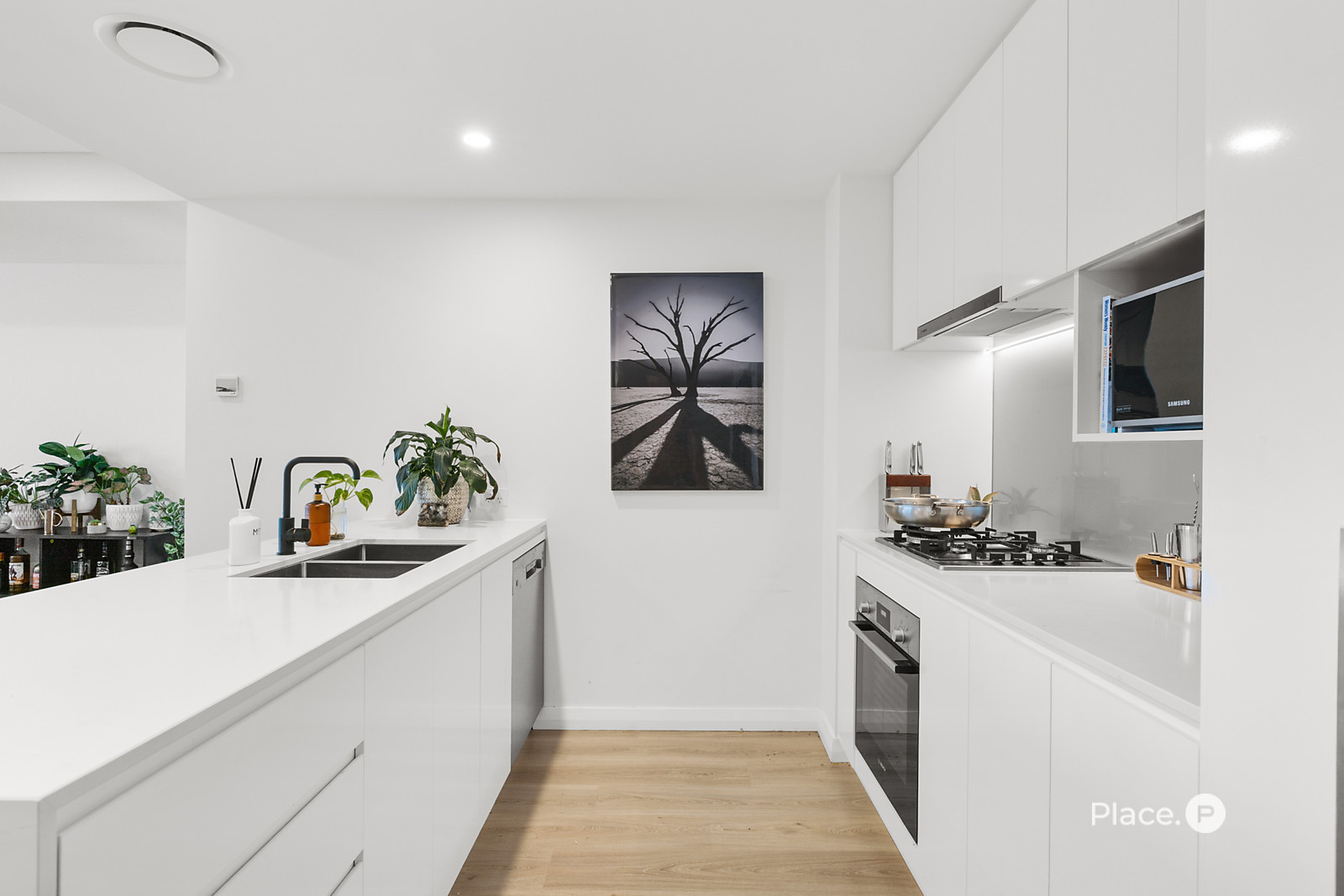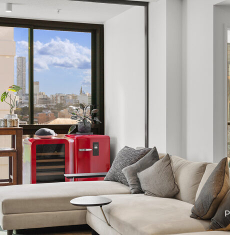 Inside, the apartment reveals one of the most generous living areas in the building — open, flowing, and filled with natural light. The layout allows you to live expansively, with room to entertain or simply to pause and take in the skyline beyond. The kitchen anchors the space with a refined mix of stone benchtops, gas cooking, and premium appliances — elegant yet entirely practical.