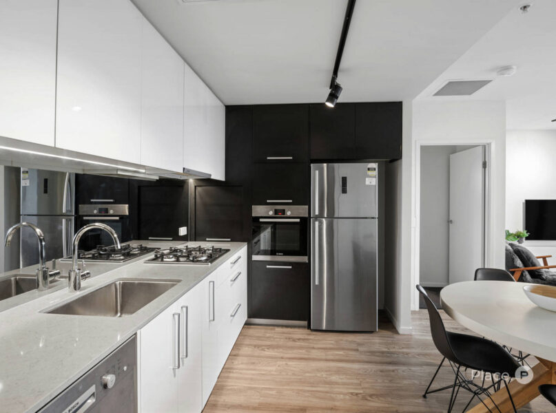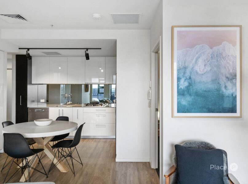 Showcasing both timber-look vinyl and carpeted floors, the apartment is made utterly sophisticated by details like floor-to-ceiling glass and a monochromatic colour palette.