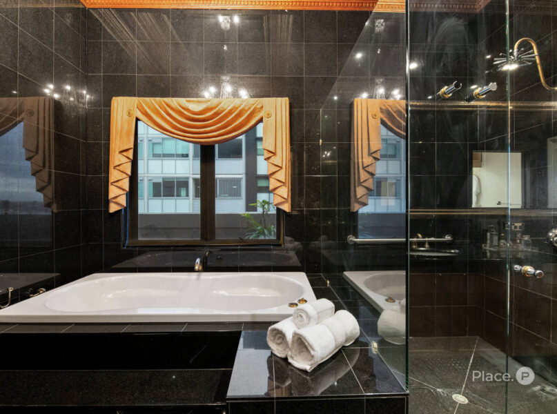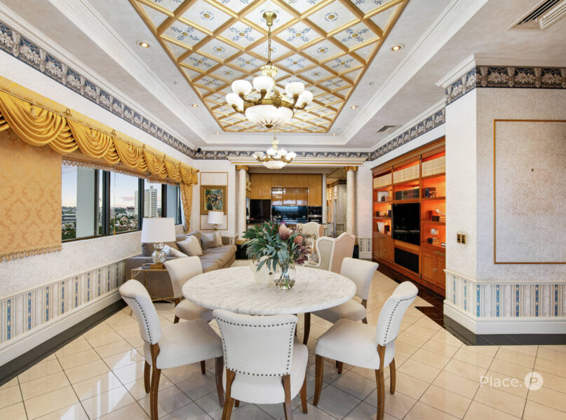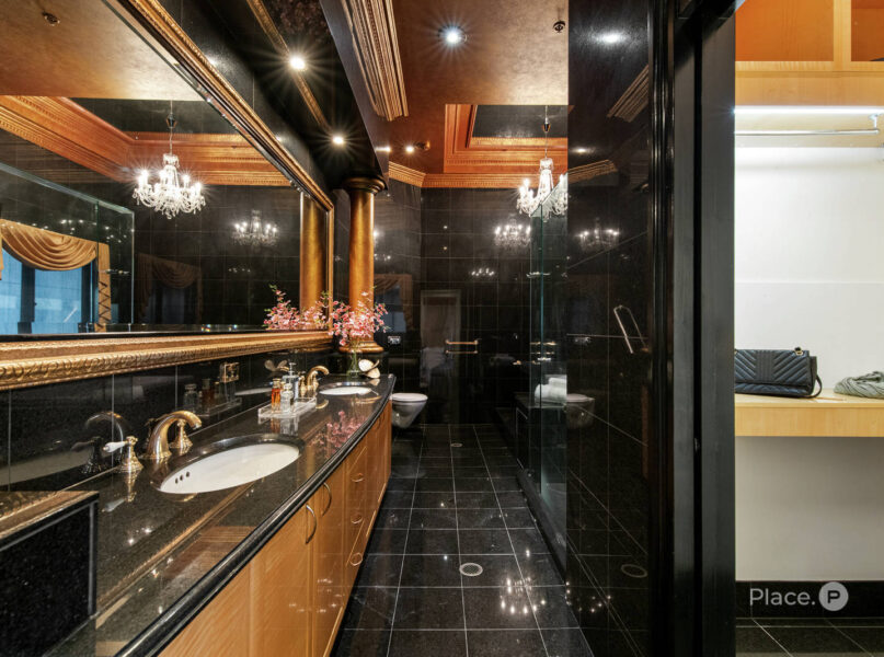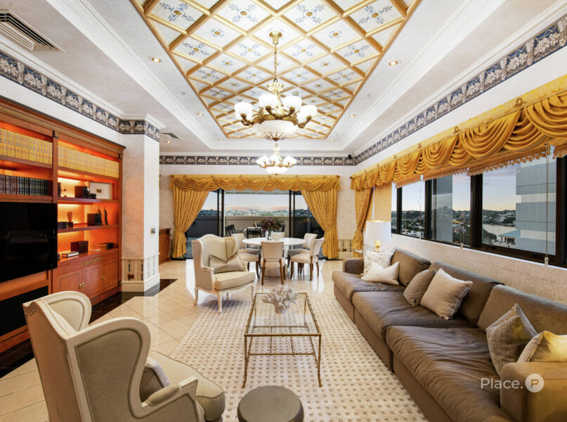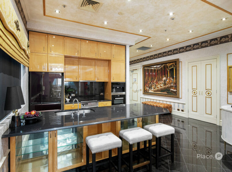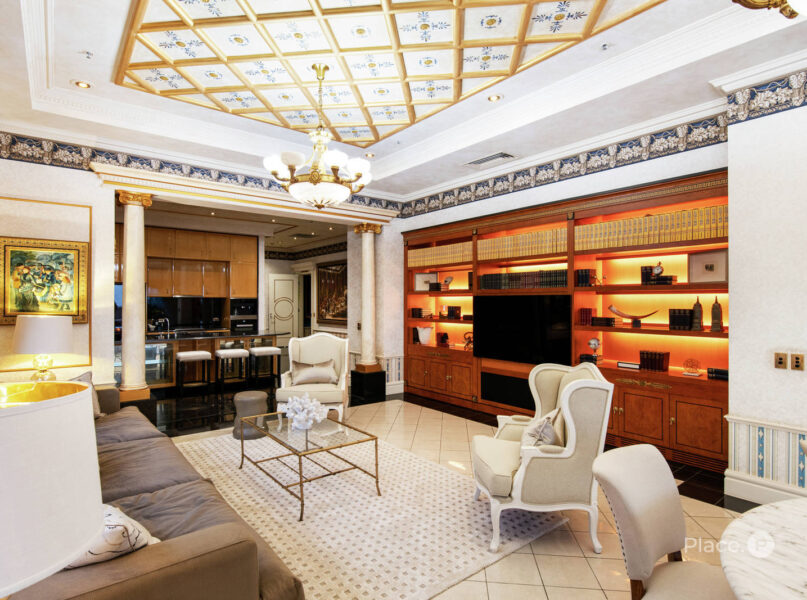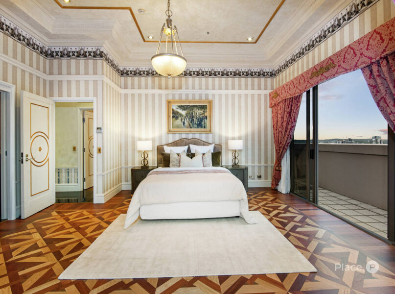 Celebrating classic grandeur, both apartments feature lofty coffered ceilings, dazzling chandeliers, parquetry timber floors, ornate cornices, and integrated joinery. Elegant tiled floors and expansive glass panels highlight the stunning vistas, ensuring a luxurious living experience.