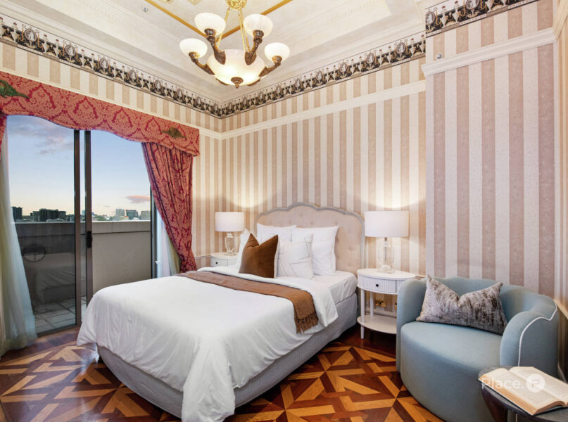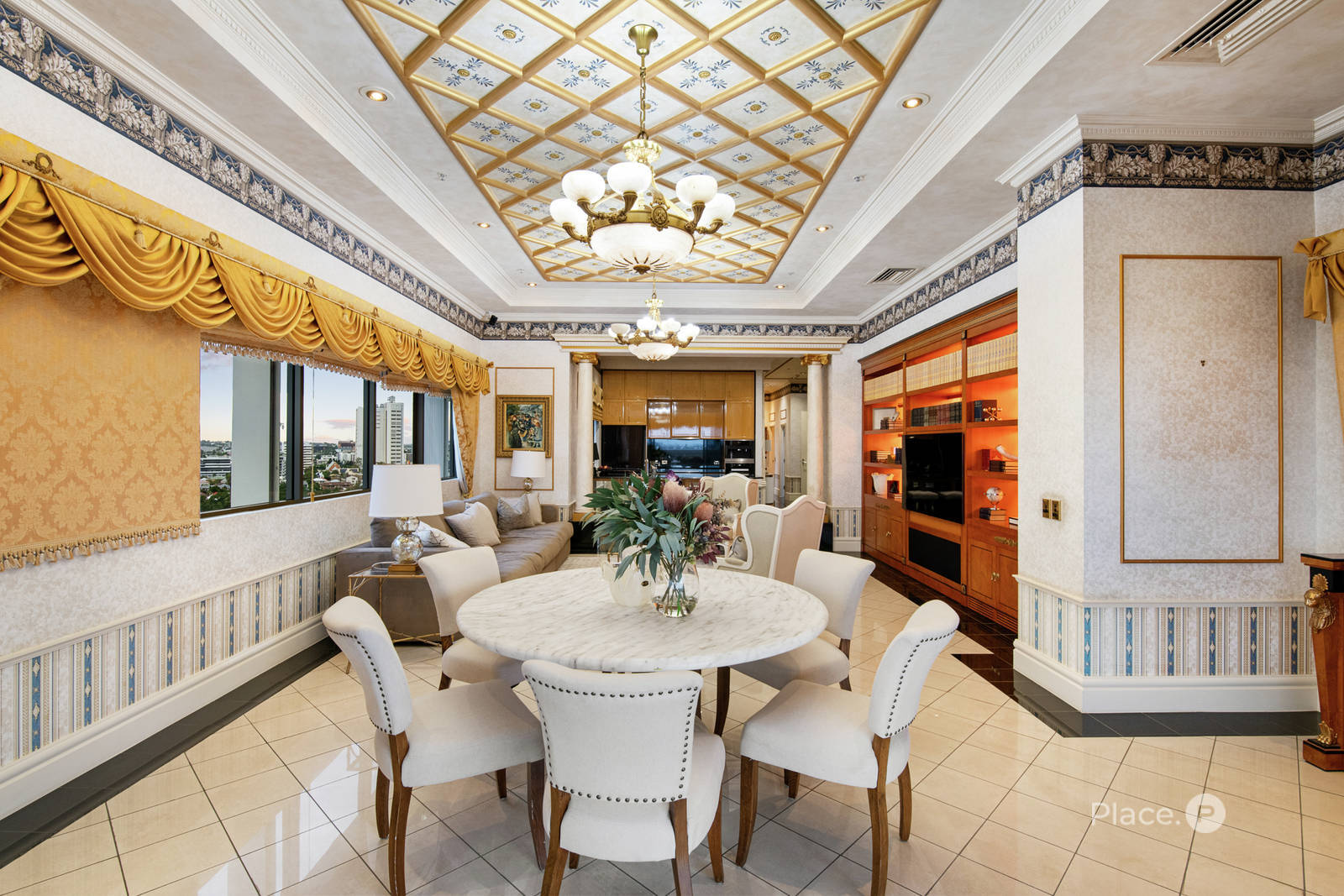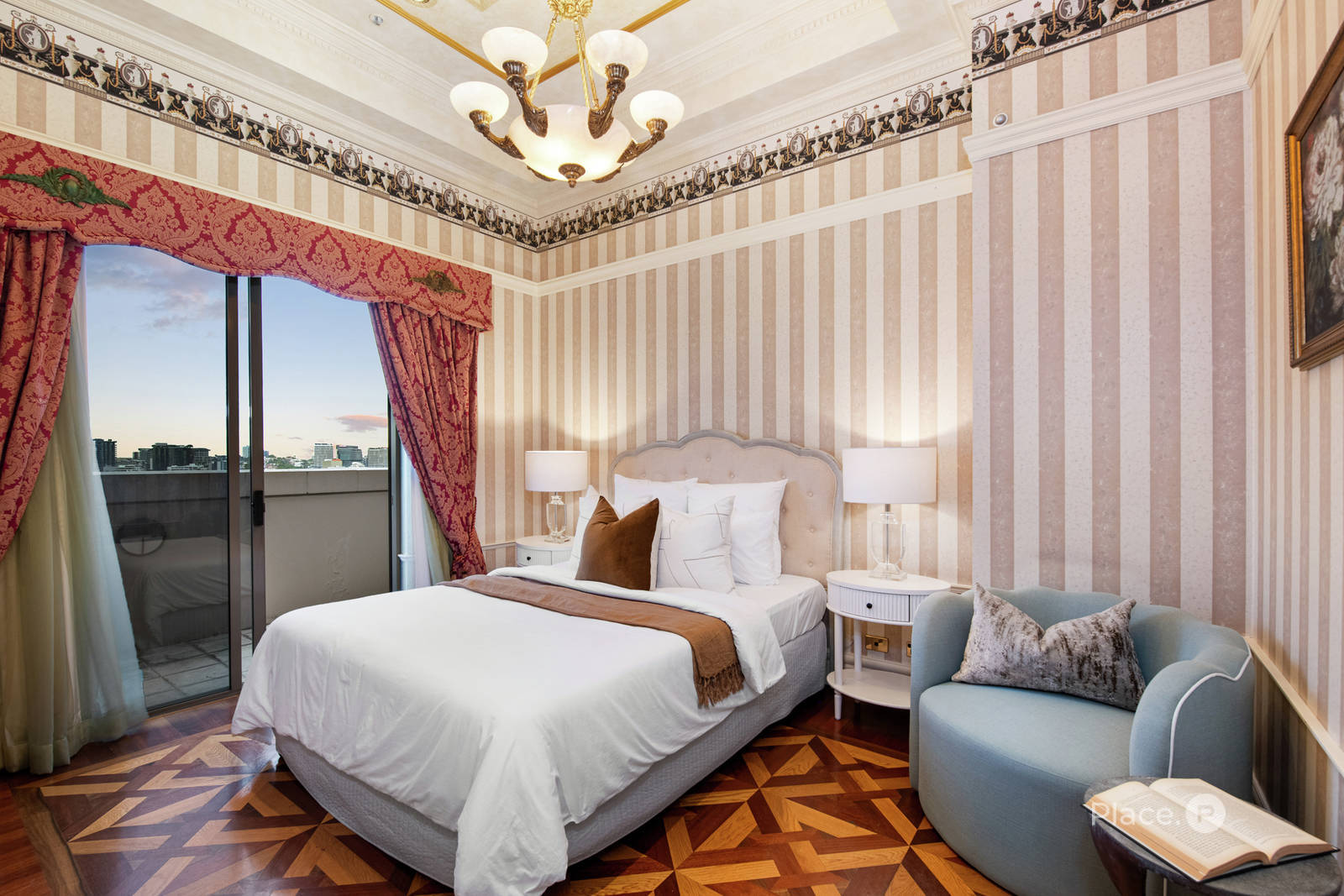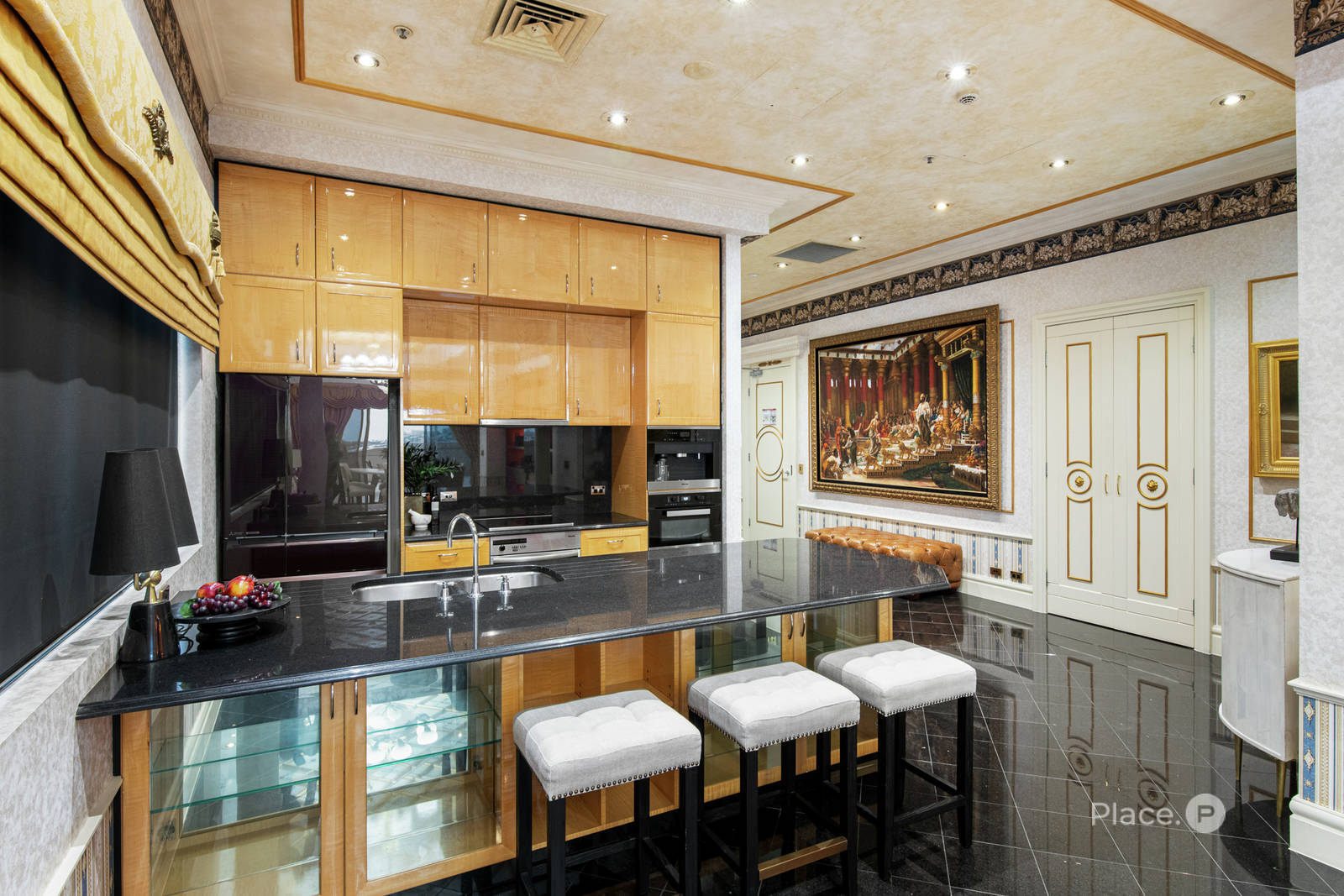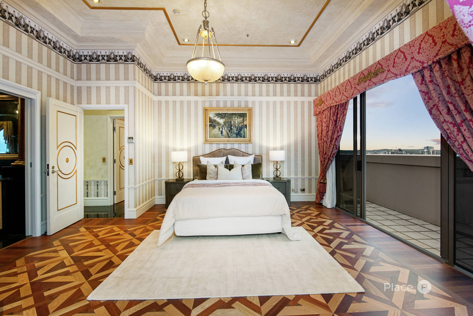 Celebrating classic grandeur, both apartments feature lofty coffered ceilings, dazzling chandeliers, parquetry timber floors, ornate cornices, and integrated joinery. Elegant tiled floors and expansive glass panels highlight the stunning vistas, ensuring a luxurious living experience.