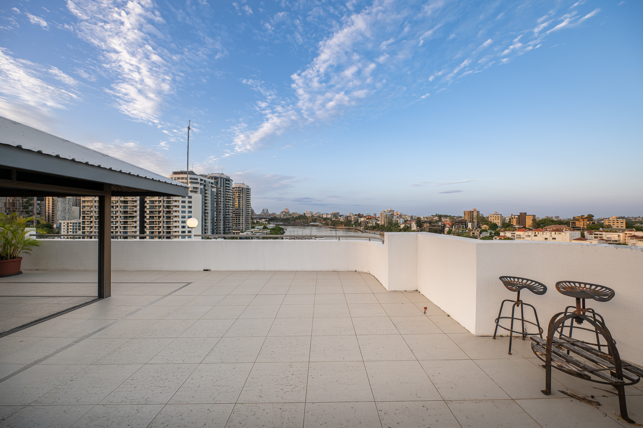 The staircase will lead to the upper level, where a private rooftop retreat unfolds. This space includes an oversized entertaining lounge, wet bar, bathroom facilities, and a vast open-air terrace, providing an exceptional setting for both relaxed living and large-scale entertaining. The panoramic river and city views from this elevated space form a breathtaking backdrop for any gathering.
