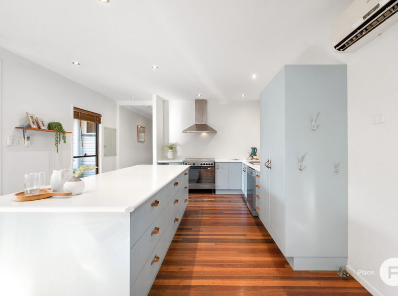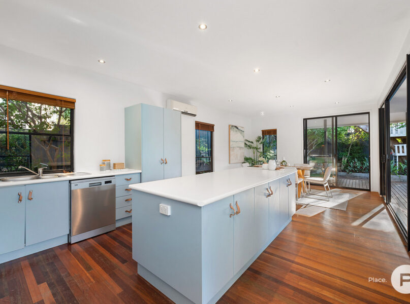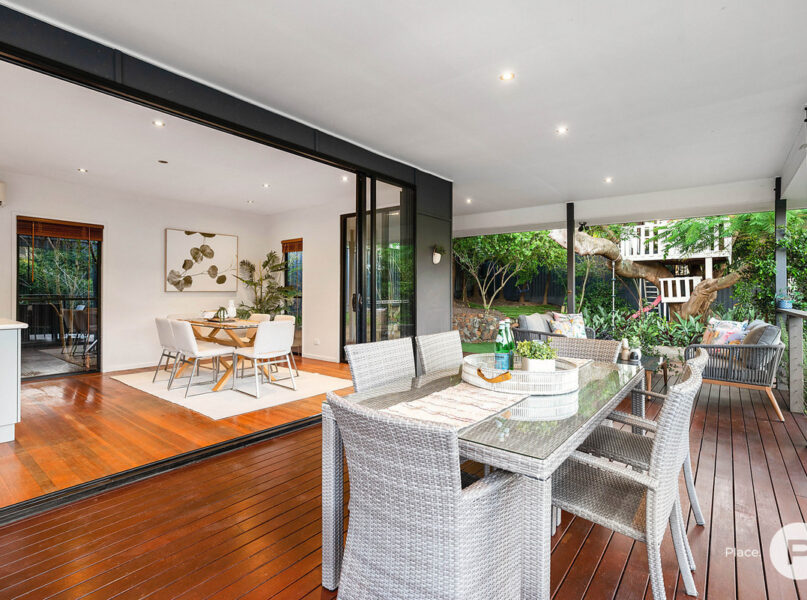· The light-filled kitchen has a gorgeous leafy outlook visible through its large stackable glass doors, allowing a natural flow throughout the home – a must have for families with children and pets alike. The kitchens position in the home is also perfect for preparing food and entertaining whilst being able to watch over your kids play safely in the private flat useable yard