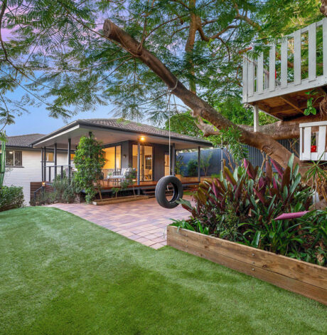 · The main focal point of the yard however is undoubtedly the beautiful large established poinciana tree. This is further showcased with a unique double storey children’s treehouse with stunning views over the nearby bushland and valley