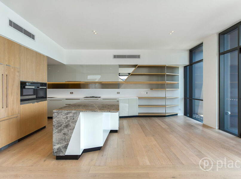 An open plan layout, with a spacious kitchen, living and dining area fronting the beautiful Bulimba riverfront. Integrated fridge and freezer, plus a suite of Miele appliances, and walk around butlers for storage, the kitchen will delight everyone. Feature Marble, American Oak Timber, Corian and neutral tones run through the apartment, creating a seamless feeling of luxury and understated elegance.