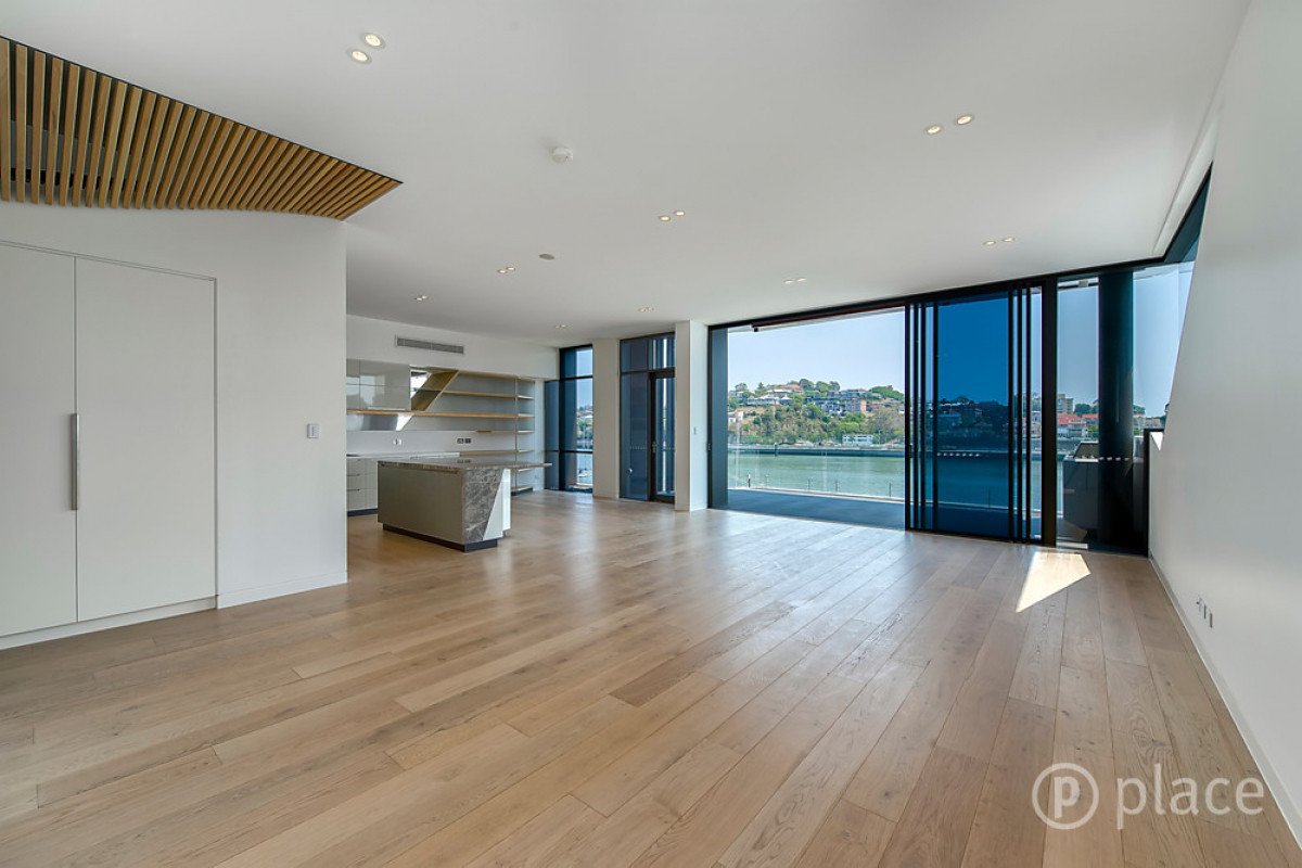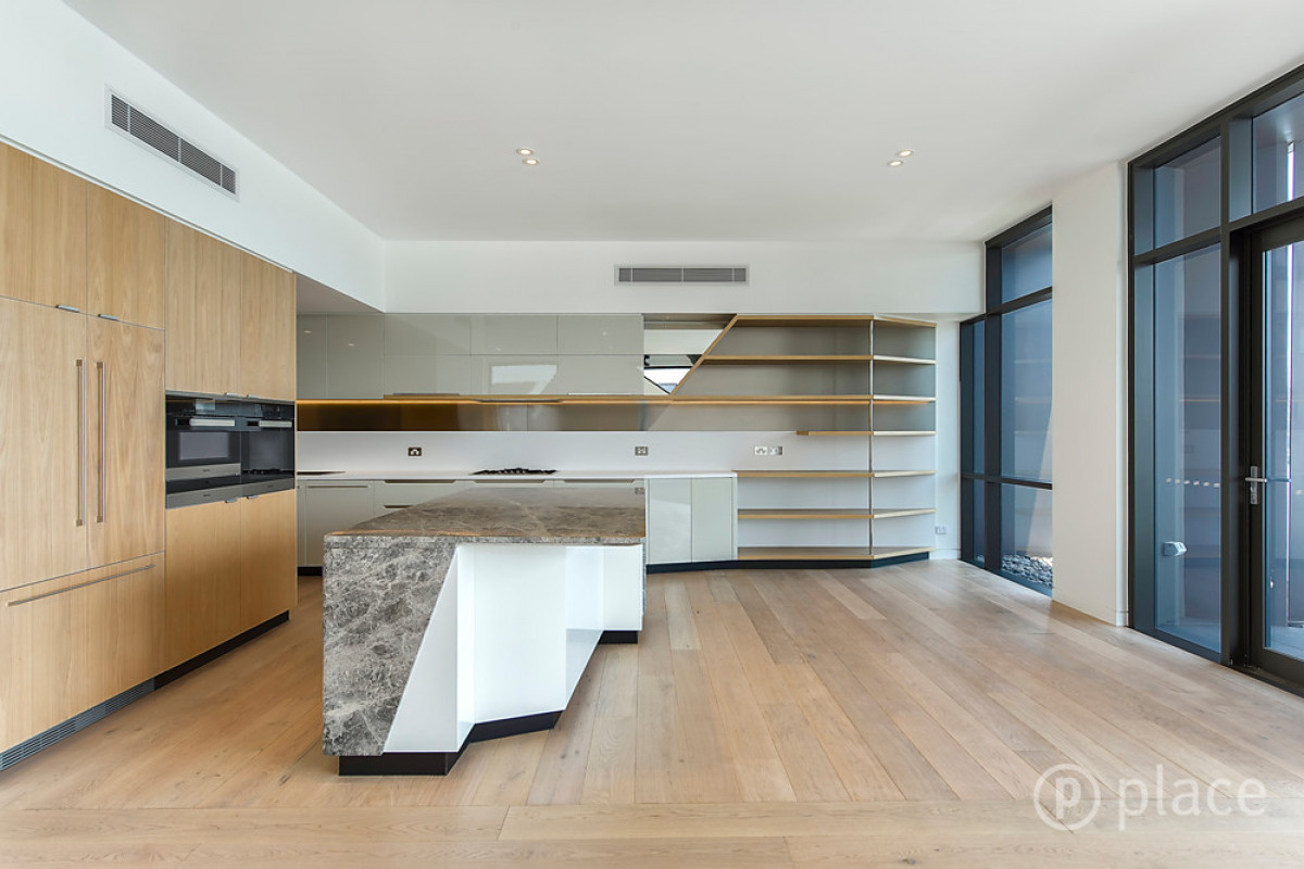 An open plan layout, with a spacious kitchen, living and dining area fronting the beautiful Bulimba riverfront. Integrated fridge and freezer, plus a suite of Miele appliances, and walk around butlers for storage, the kitchen will delight everyone. Feature Marble, American Oak Timber, Corian and neutral tones run through the apartment, creating a seamless feeling of luxury and understated elegance.