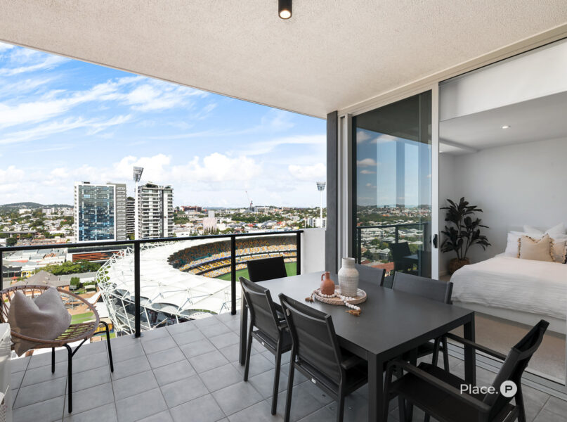 The expansive open-plan living area flows seamlessly onto a generous entertainer’s balcony, where uninterrupted views capture the dynamic energy of the Gabba and the evolving Brisbane skyline beyond. The master suite is a peaceful retreat with direct balcony access and a sleek ensuite, while the wide-format engineered flooring, full-height glazing, and soft textures throughout create a refined yet relaxed atmosphere.