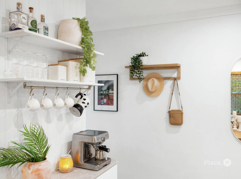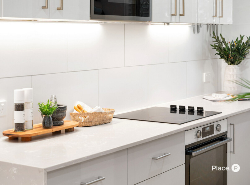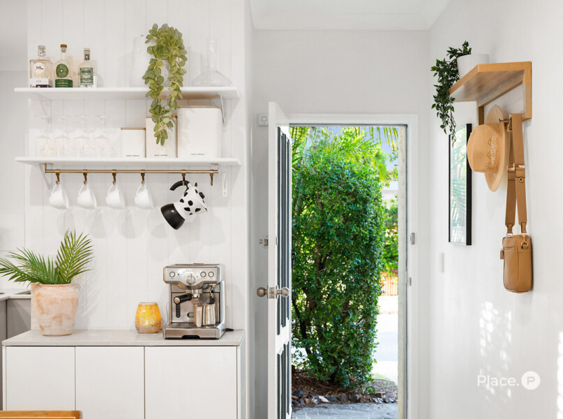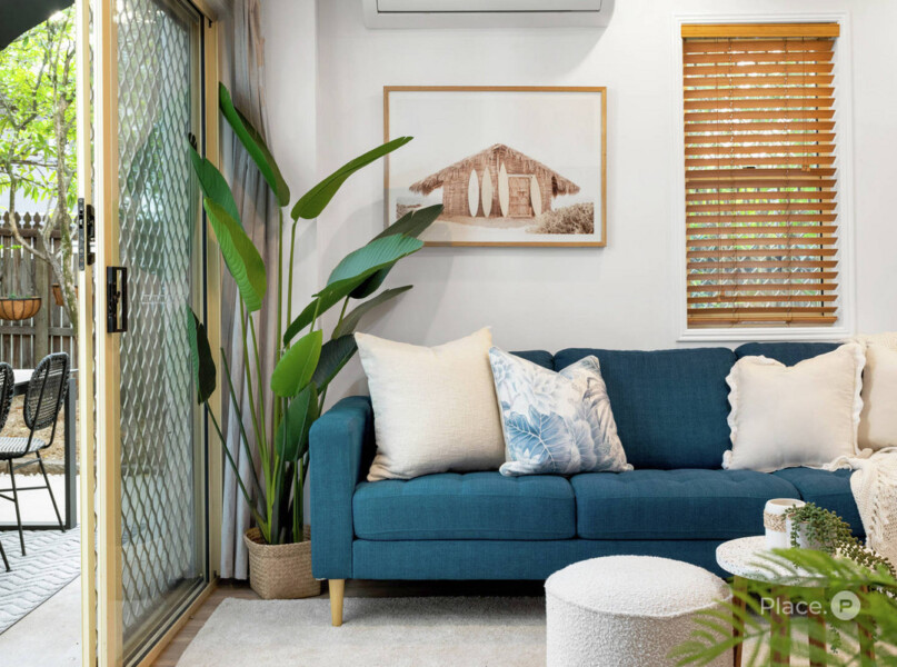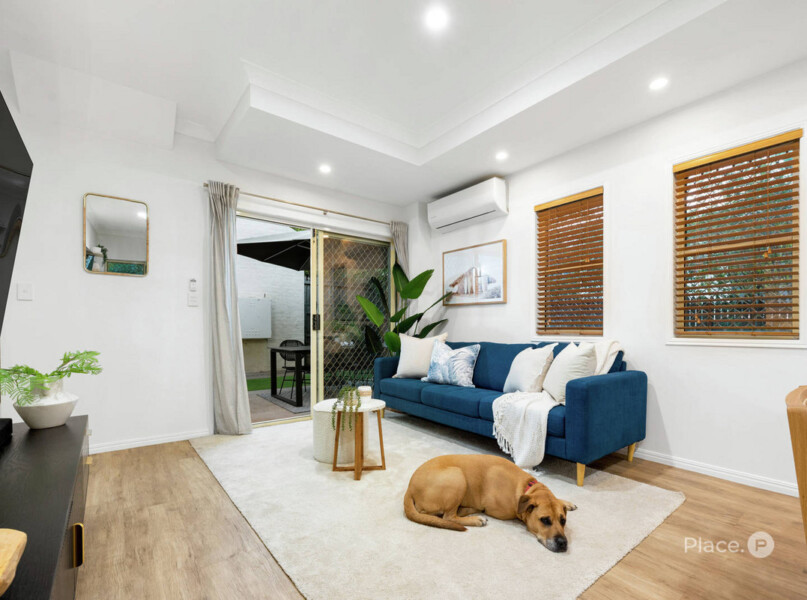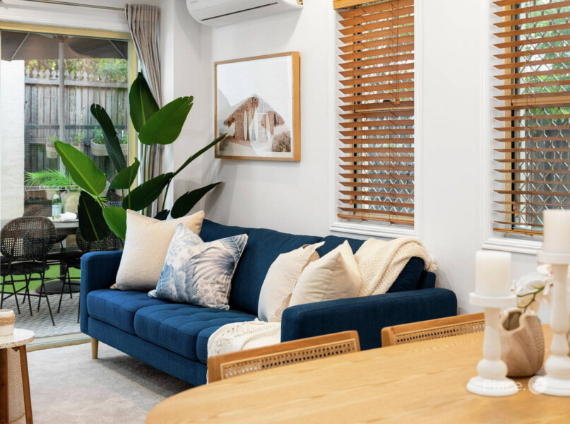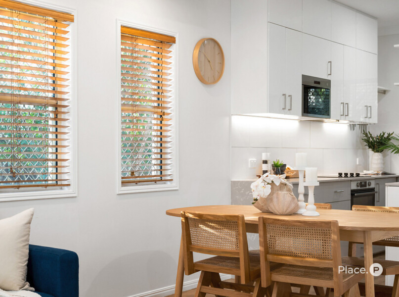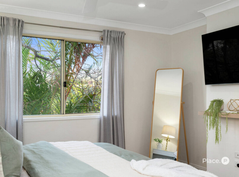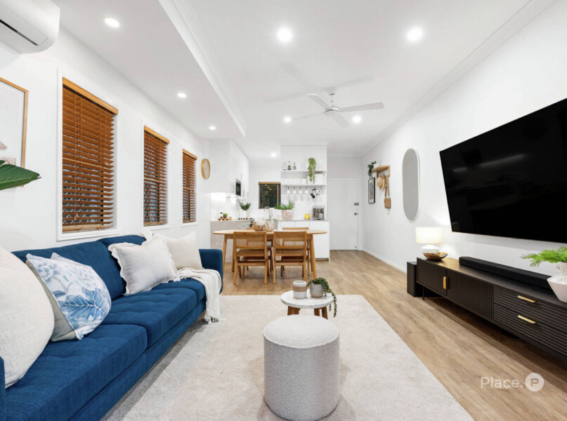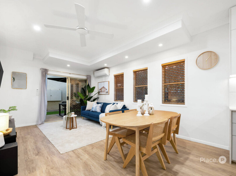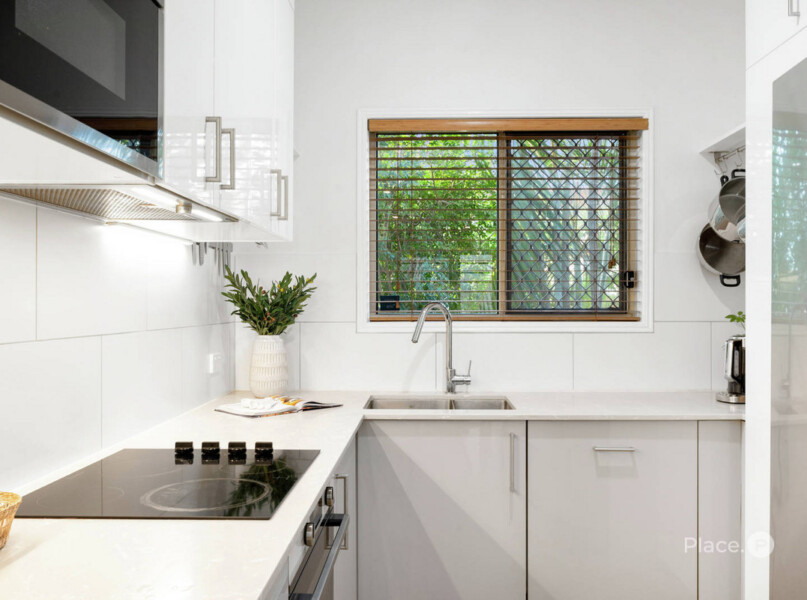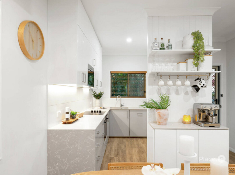The heart of the home is an expansive open-plan living, dining, and kitchen area, where natural light floods the space. You’ll find a ceiling fan and a split-system air conditioning unit in this area, ensuring comfort in all seasons. The modern kitchen is a highlight, featuring updated appliances, ample storage, and sleek stone benchtops that add a touch of elegance to the space.