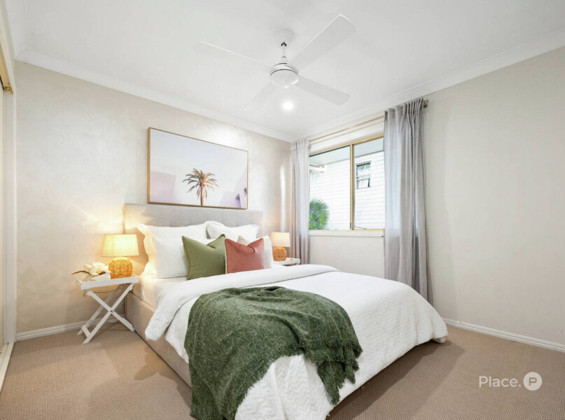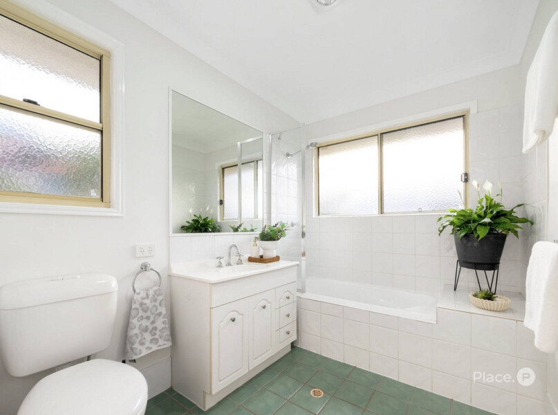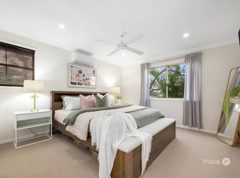 Upstairs, you’ll discover three bedrooms, each equipped with ceiling fans and built-in robes. The master bedroom offers a walk-in robe, an ensuite for added privacy, and a split-system air conditioner, allowing for personalized climate control.