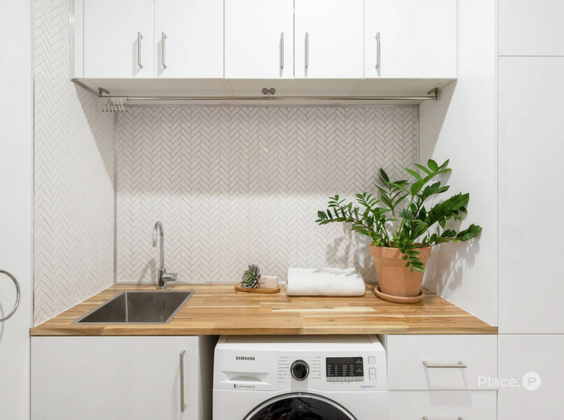 The renovated laundry space provides added convenience with direct access to the outdoors, while the single-car garage offers both secure parking and extra storage space.