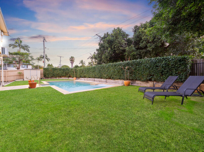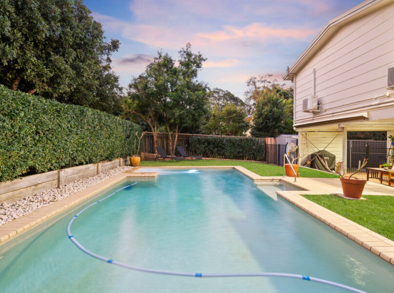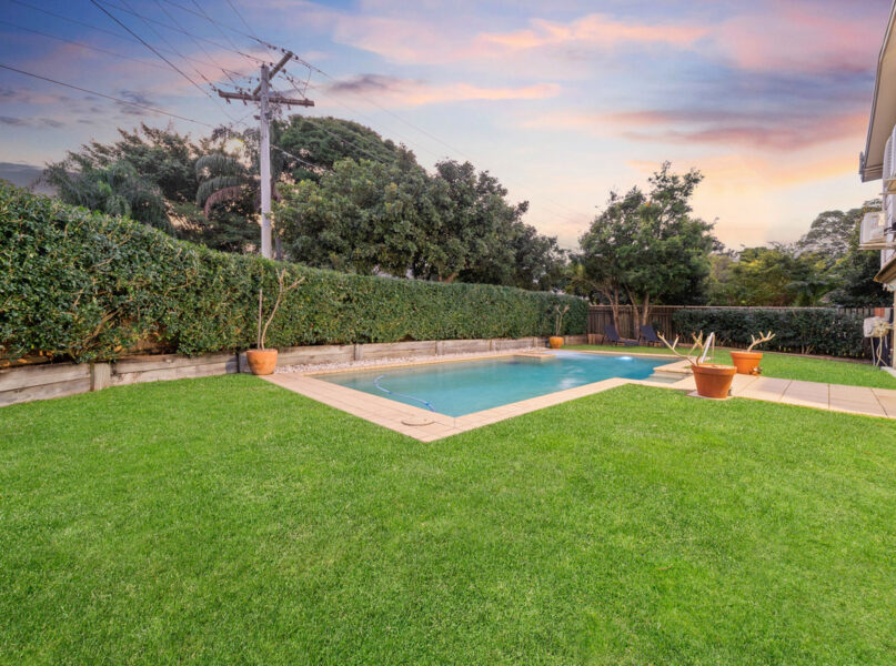 – Modern solar heated in-ground pool with spa feature surrounded by near new sir walter grass & manicured hedges