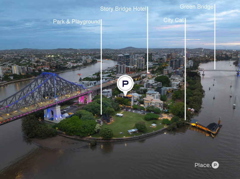 Perfectly positioned to overlook the greenery of Captain Burke Park, it has the feeling of a residential village with nearby outstanding restaurants, bars, riverside cafes, microbrewery, French patisserie, iconic jazz club and the historic Story Bridge Hotel.