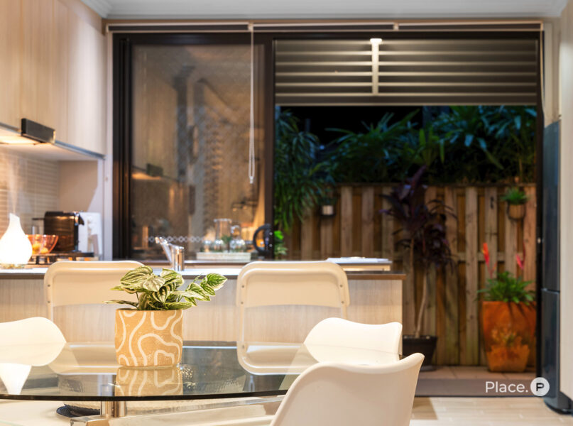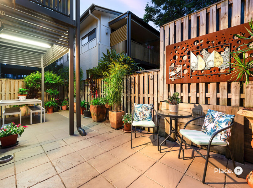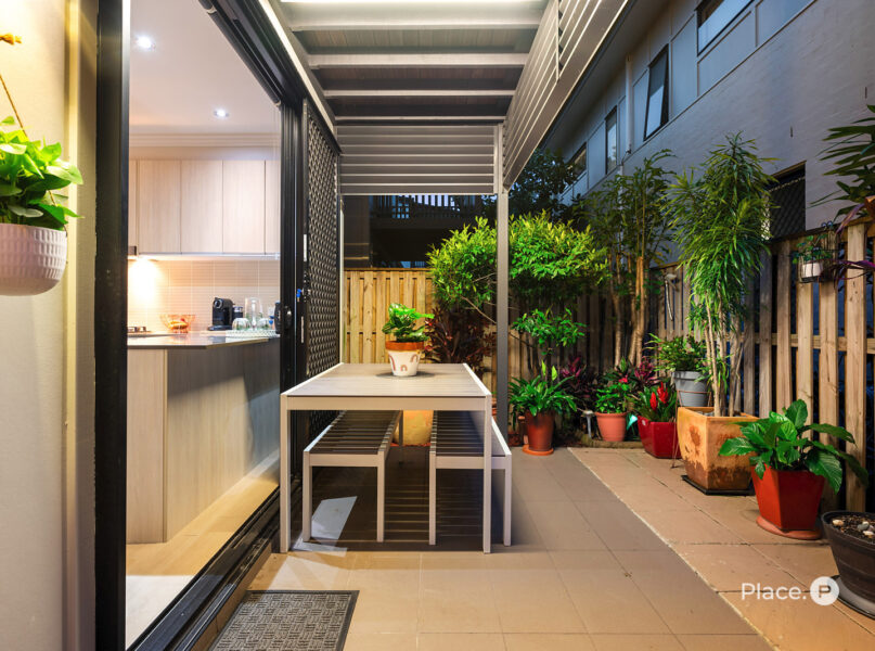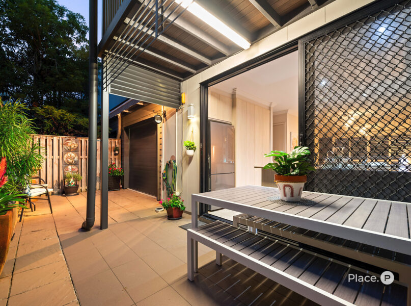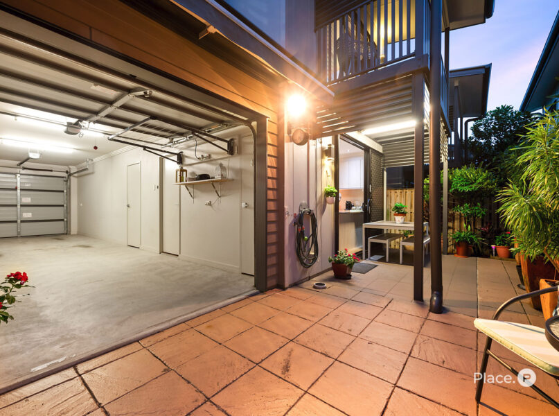 The open-plan living and dining areas seamlessly connect to the rear covered patio, creating an effortless indoor-outdoor flow. This sunlit patio is a tranquil space ideal for relaxation or entertaining – perfect for unwinding with a glass of wine or starting your day with coffee and a good book. The garage is secure and has space for 2 cars tandem with a second roll-a-door at the back making it easy to move furniture in or out. A motorised folding arm awning extends from the top of the roll-a-door at the rear of the garage providing instant shade protection over the patio.
